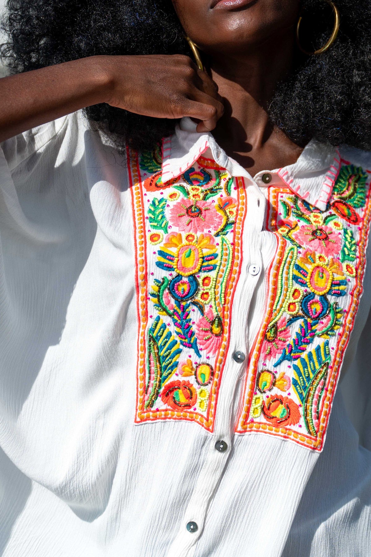 Blouse ample au style bohème, confectionnée dans une matière légère et fluide. Les broderies décoratives placées sur le devant apportent une touche artisanale et élégante.