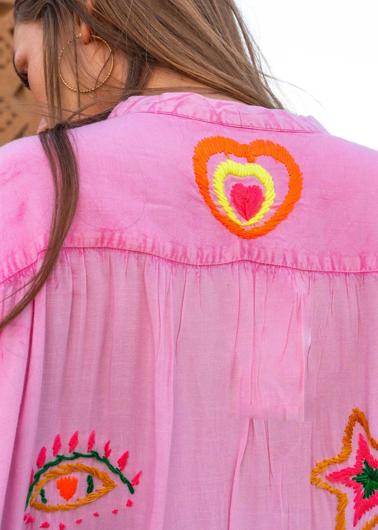 Elle se distingue par de broderies colorées placées à l’avant, apportant une touche artisanale et solaire. Le dos est sublimé par des broderies graphiques et symboles brodés, qui donnent tout le caractère à la pièce. Les manches longues légèrement bouffantes ajoutent du volume et renforcent son esprit bohème.