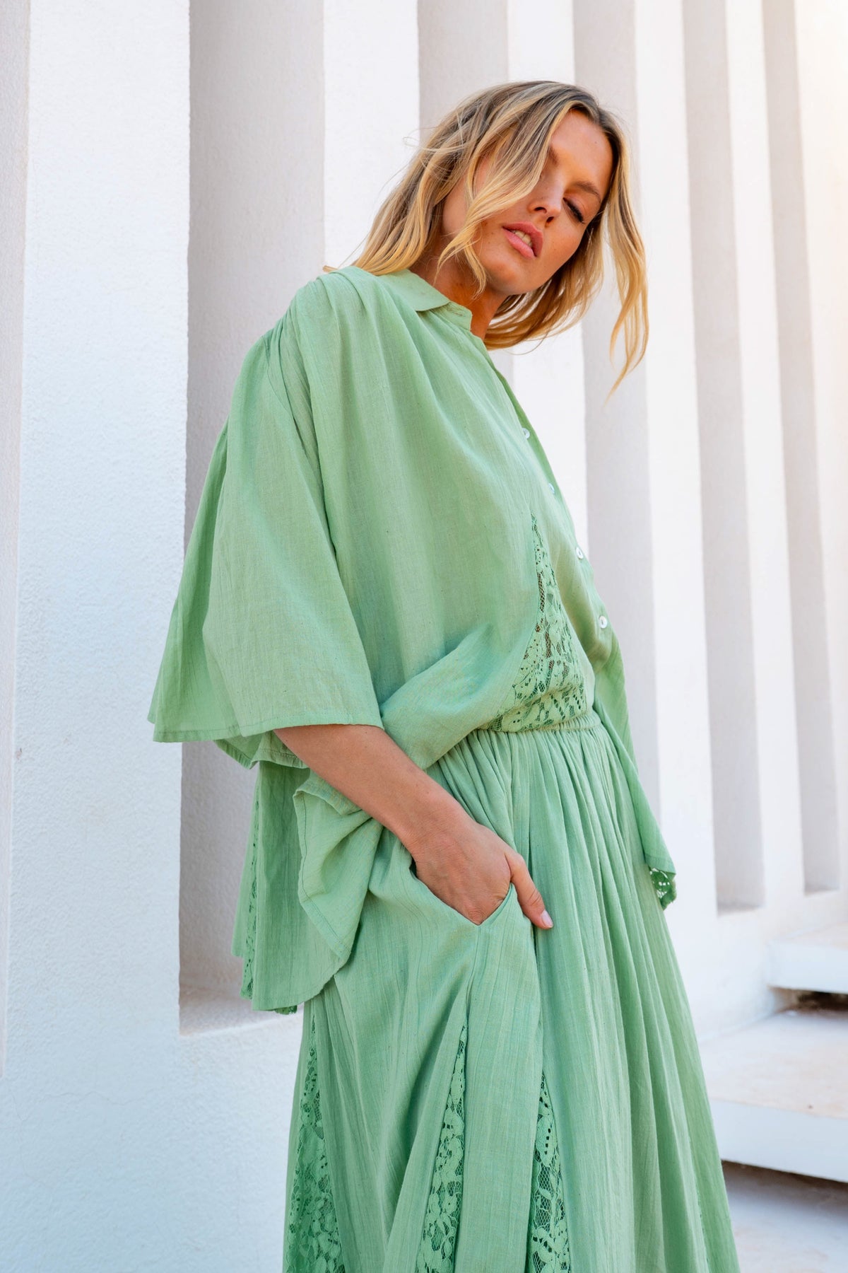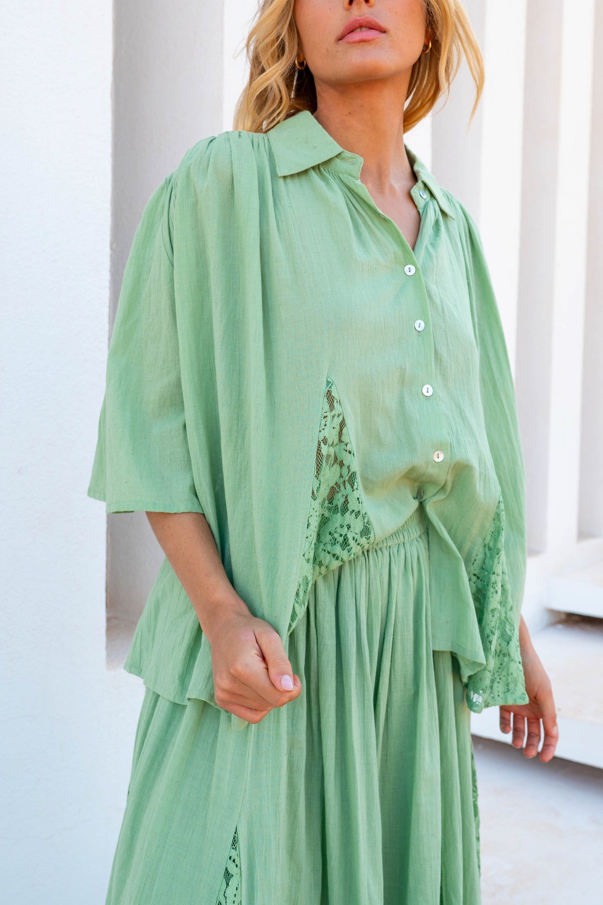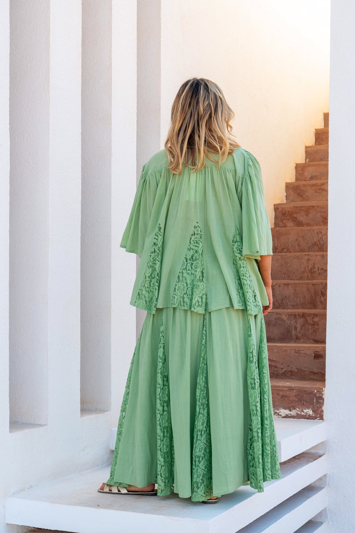Les empiècements en dentelle ajoutent une touche féminine et raffinée. Cette blouse peut se porter seule ou associée à la jupe Noa pour un look harmonieux et élégant.