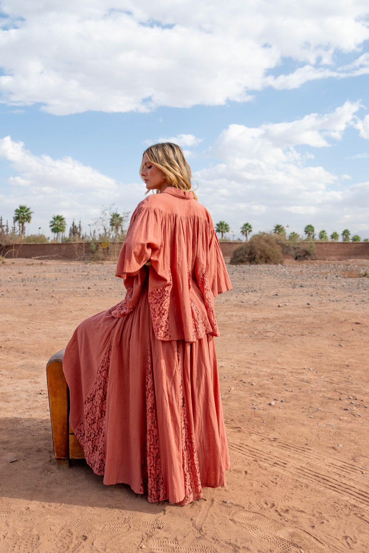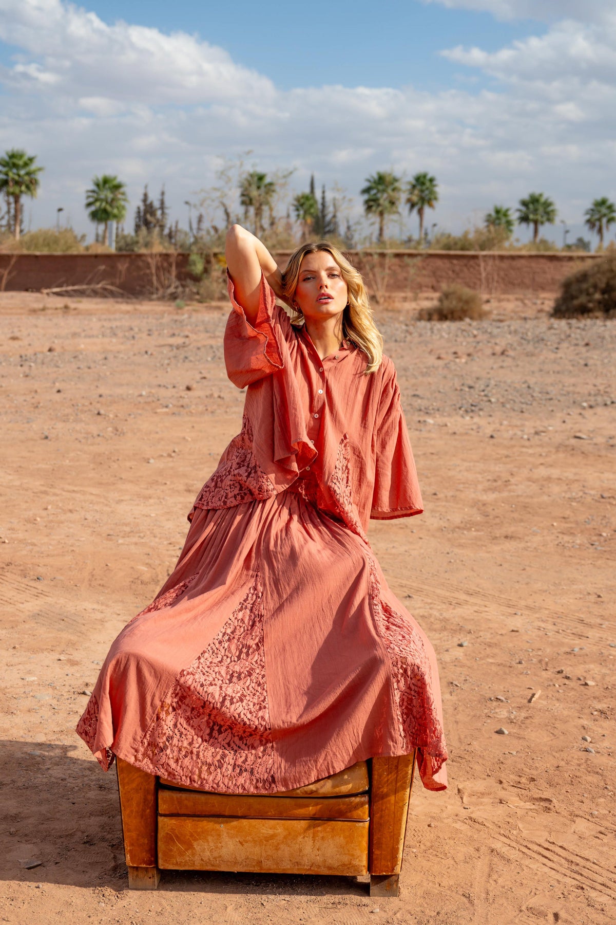Les empiècements en dentelle ajoutent une touche féminine et raffinée. Cette blouse peut se porter seule ou associée à la jupe Noa pour un look harmonieux et élégant.