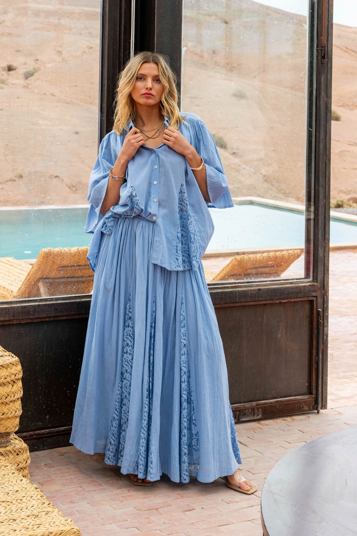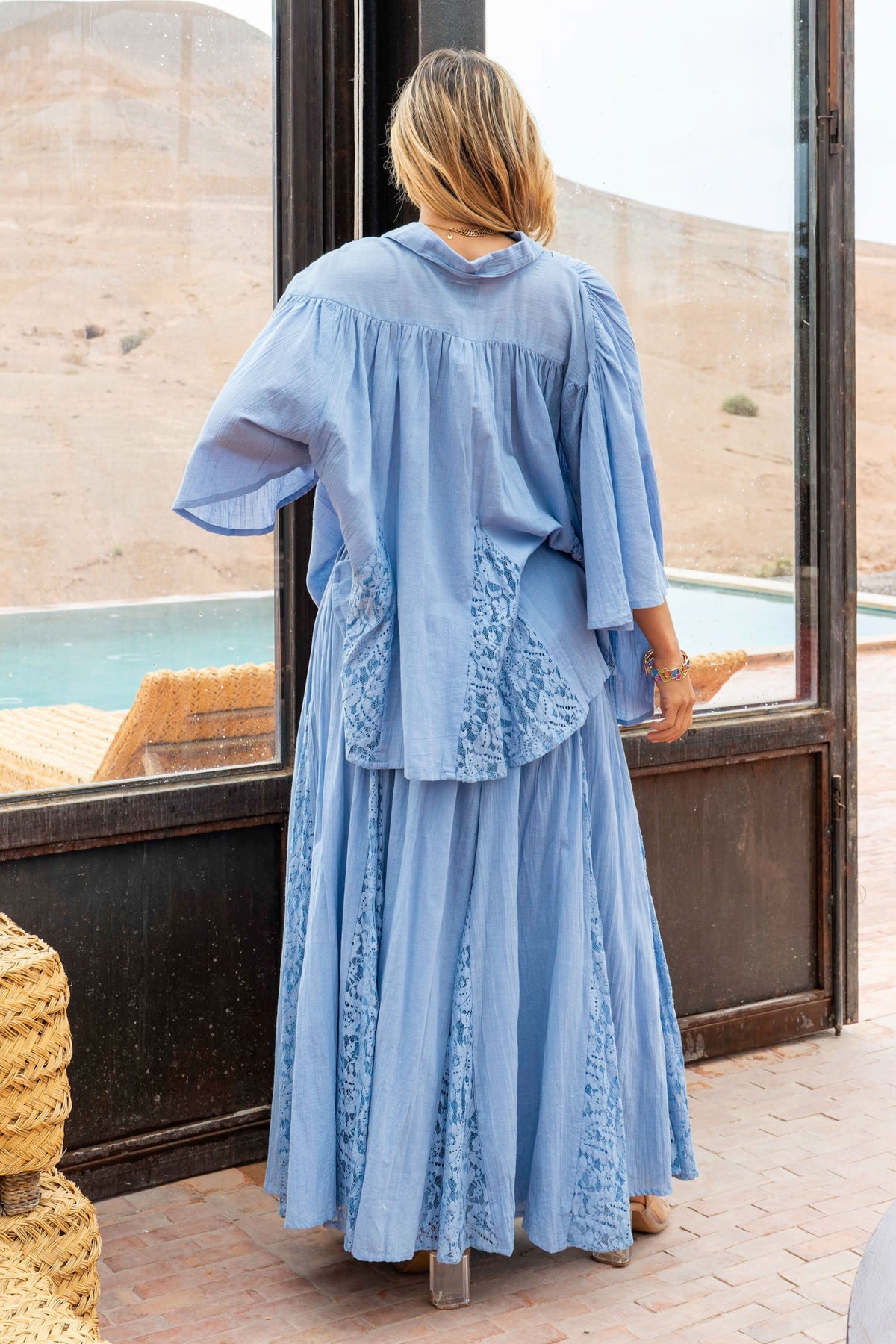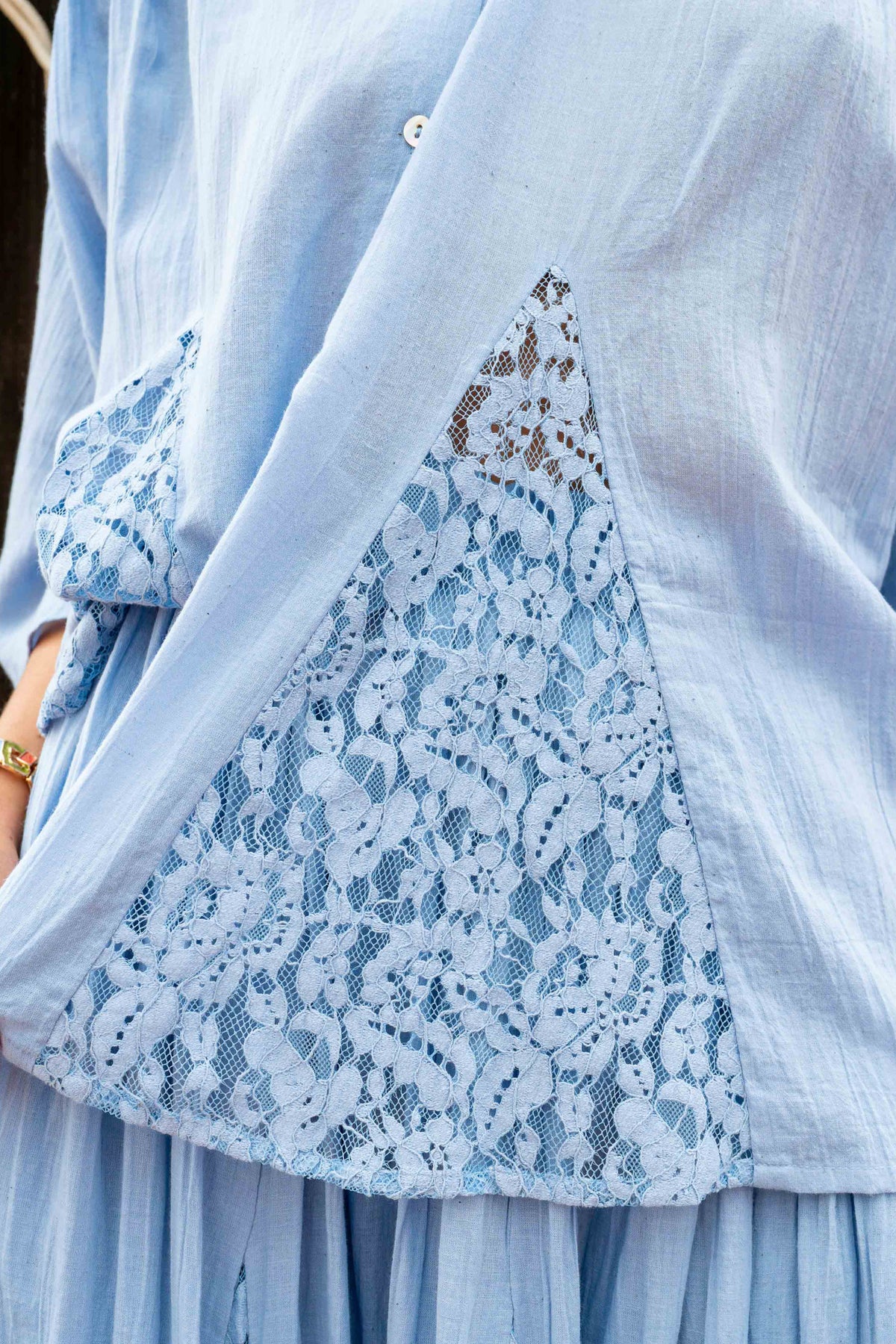 Les empiècements en dentelle ajoutent une touche féminine et raffinée. Cette blouse peut se porter seule ou associée à la jupe Noa pour un look harmonieux et élégant.
