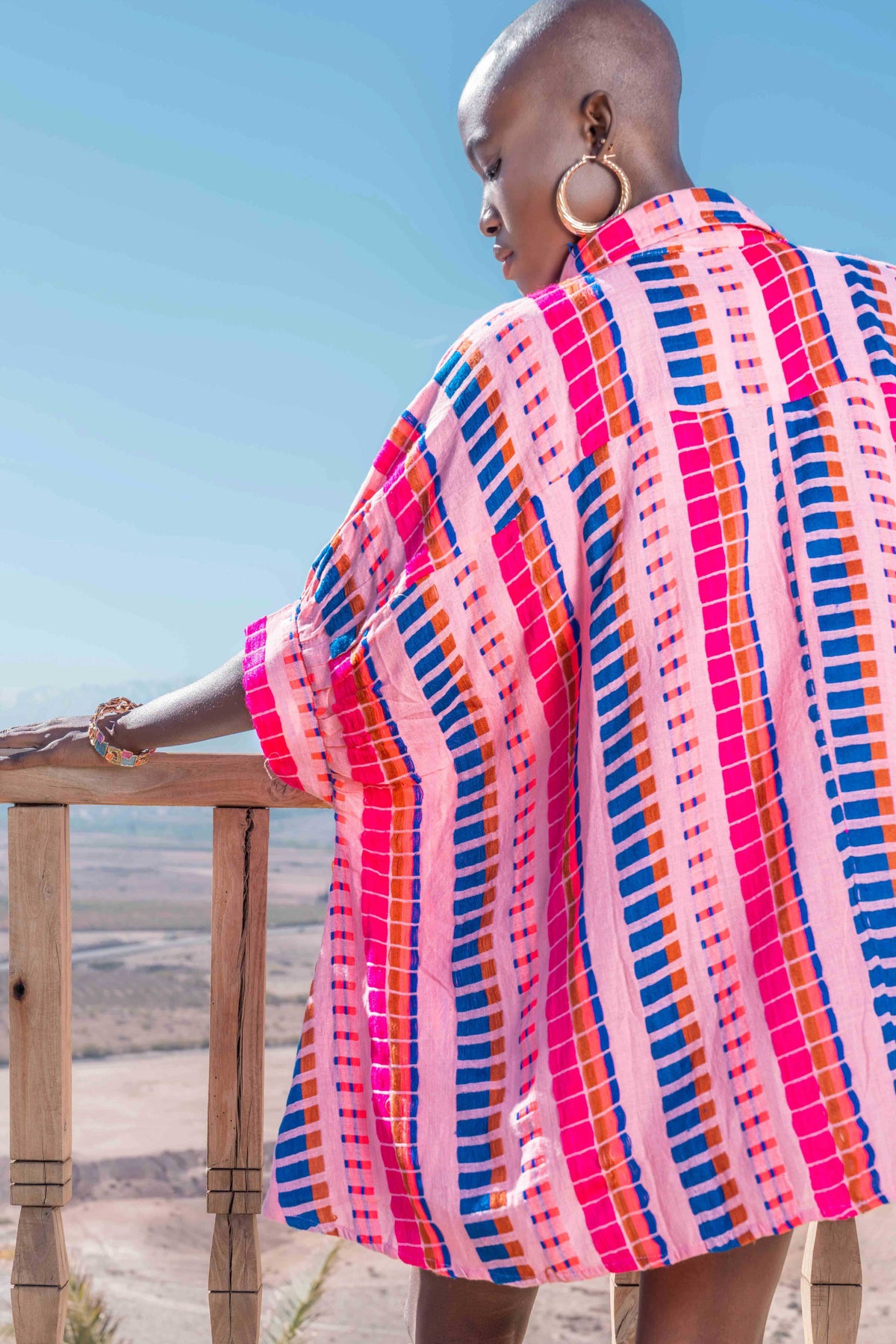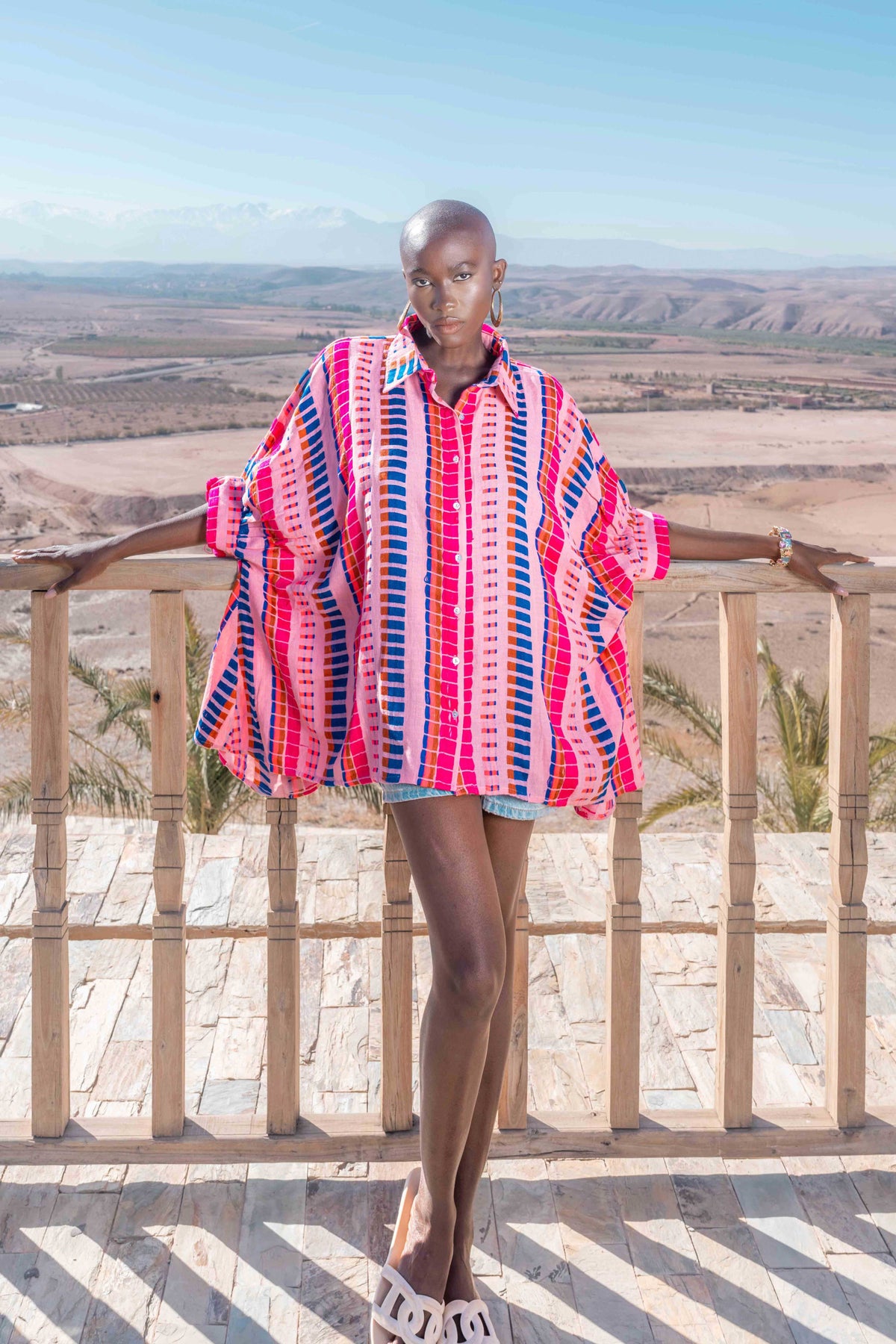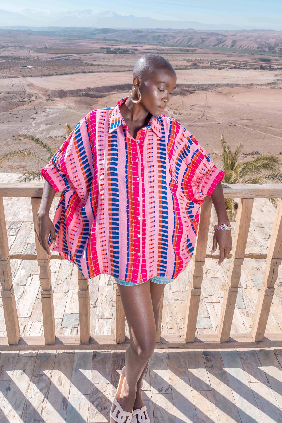 Blouse oversize à la coupe ample et fluide, sublimée par un motif rayé vertical. Sa silhouette généreuse crée un tombé aérien et moderne, idéal pour les looks estivaux décontractés.