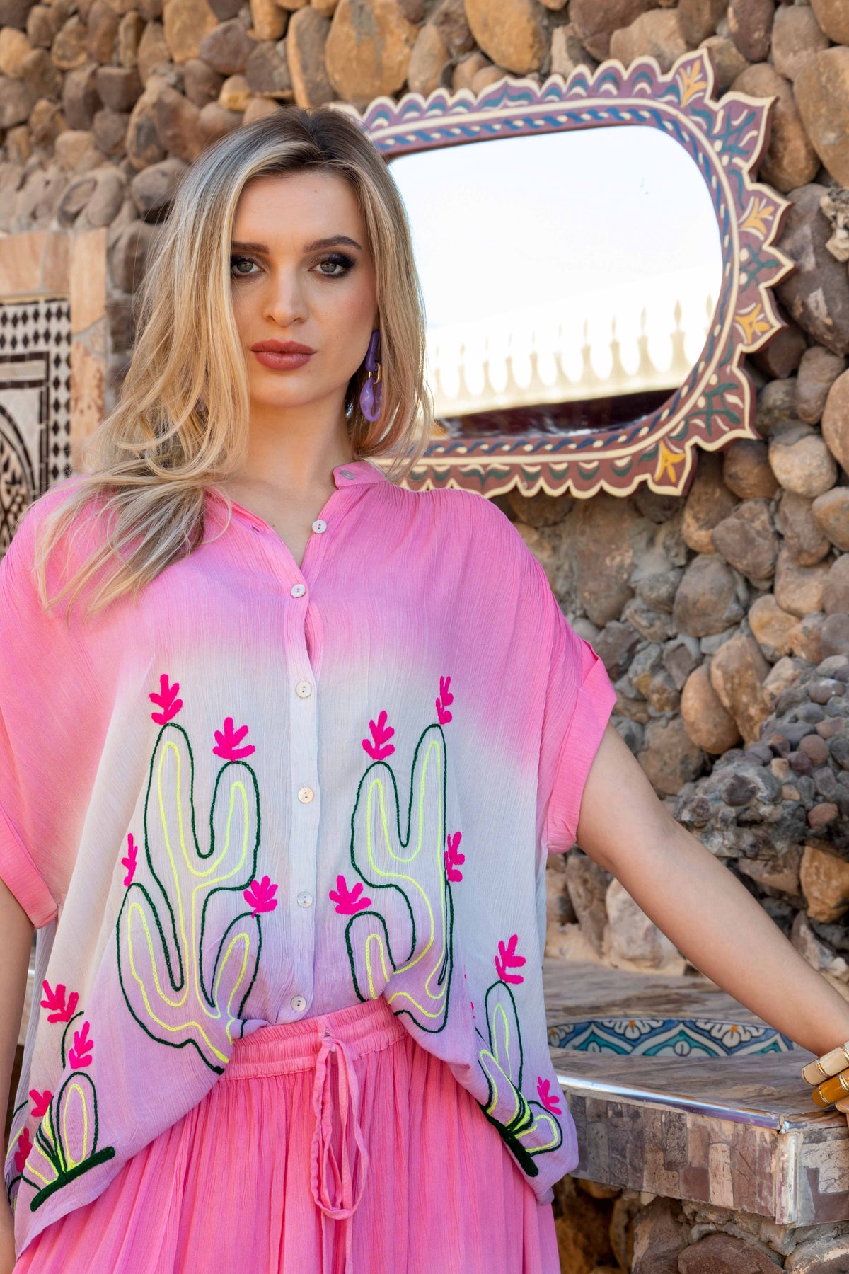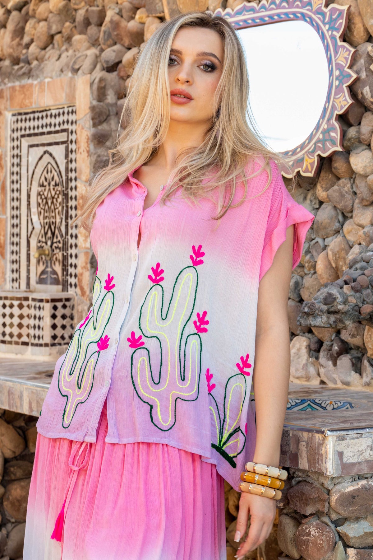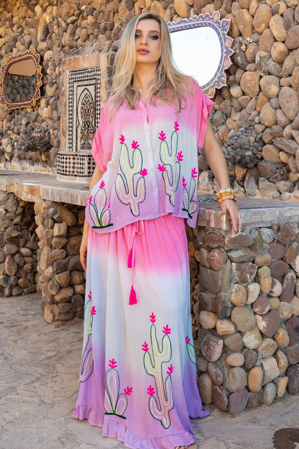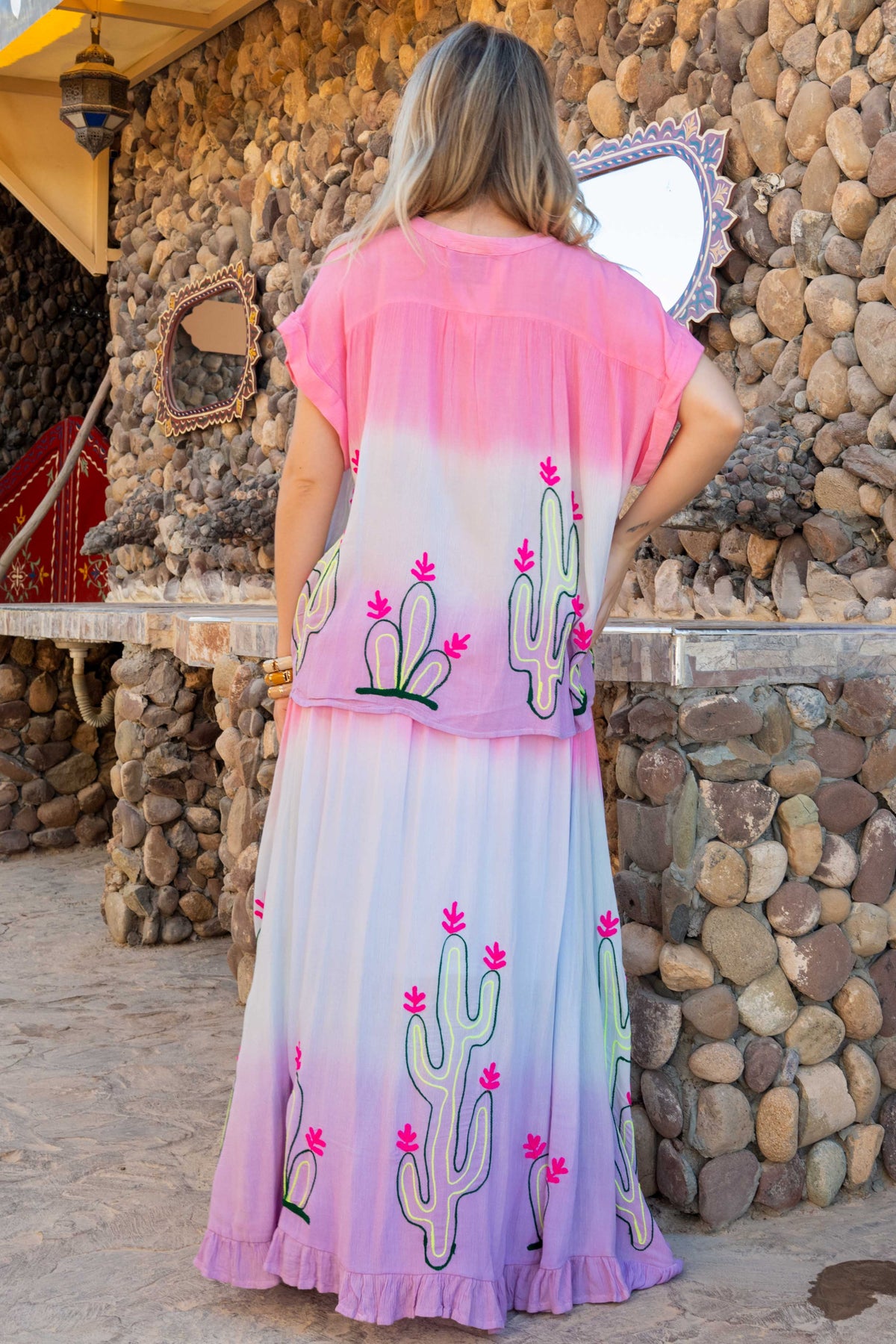 Le haut séduit par sa coupe ample et confortable, son col légèrement ouvert et son boutonnage discret sur le devant. La jupe longue offre un tombé fluide et aérien, idéal pour un porté quotidien comme pour les beaux jours. Les broderies cactus placées sur l’ensemble apportent une touche artisanale et originale, véritable signature de la pièce.