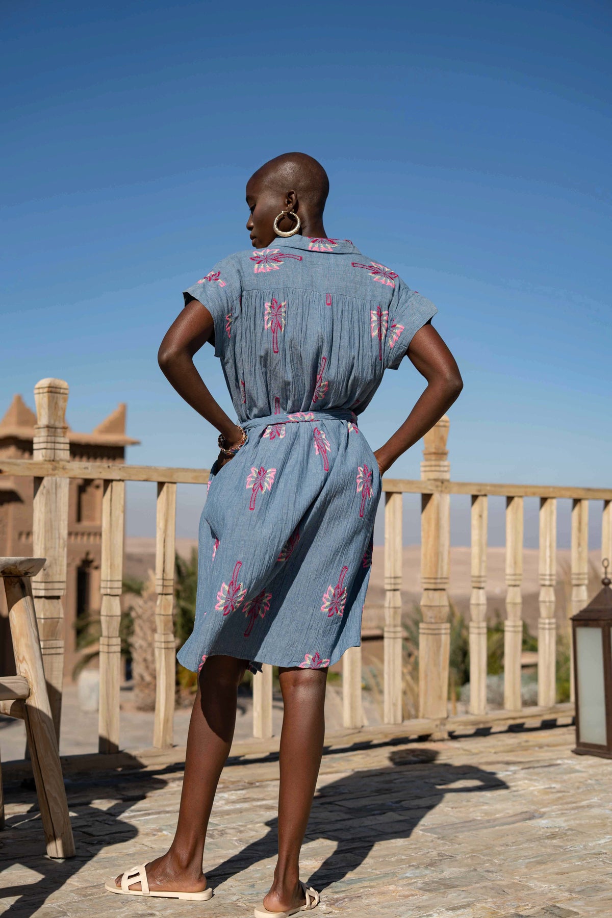 Robe chemise courte au style bohème, confectionnée dans une matière légère et fluide. Elle est ornée de motifs brodés colorés qui apportent une touche artisanale et estivale.
