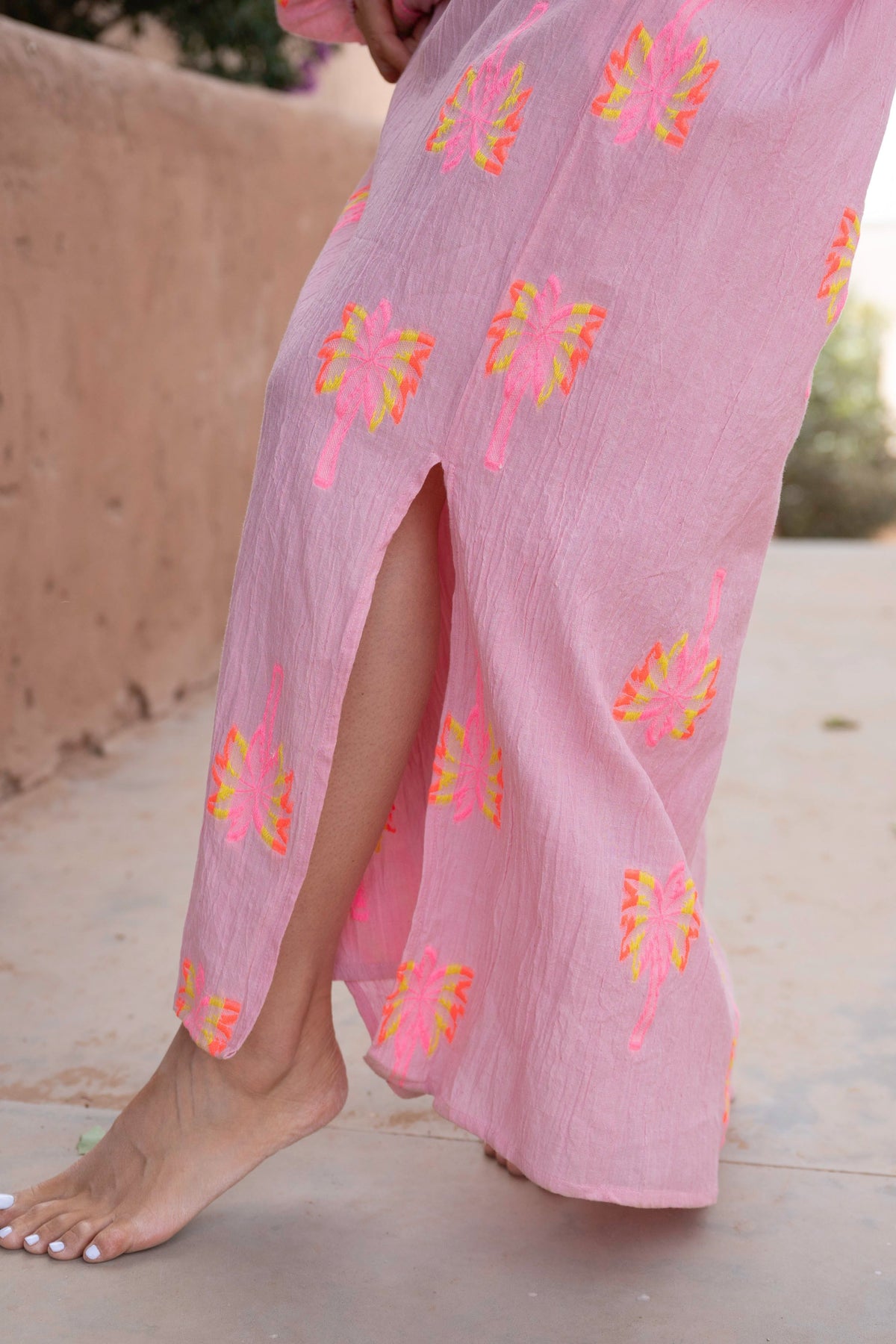 Ornée de motifs brodés colorés, elle se porte aussi bien fermée en robe que ouverte en sur-robe pour varier les styles. Un modèle confortable et facile à porter, idéal pour la saison estivale.