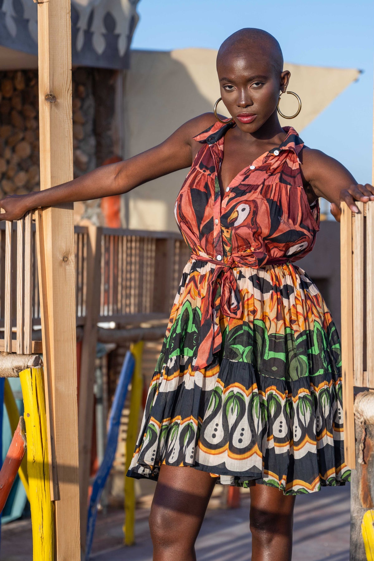 Robe courte à imprimé multicolore, conçue dans une matière légère et fluide. Elle présente un décolleté en V, un col chemise, et une ceinture à nouer à la taille permettant d’ajuster la silhouette.