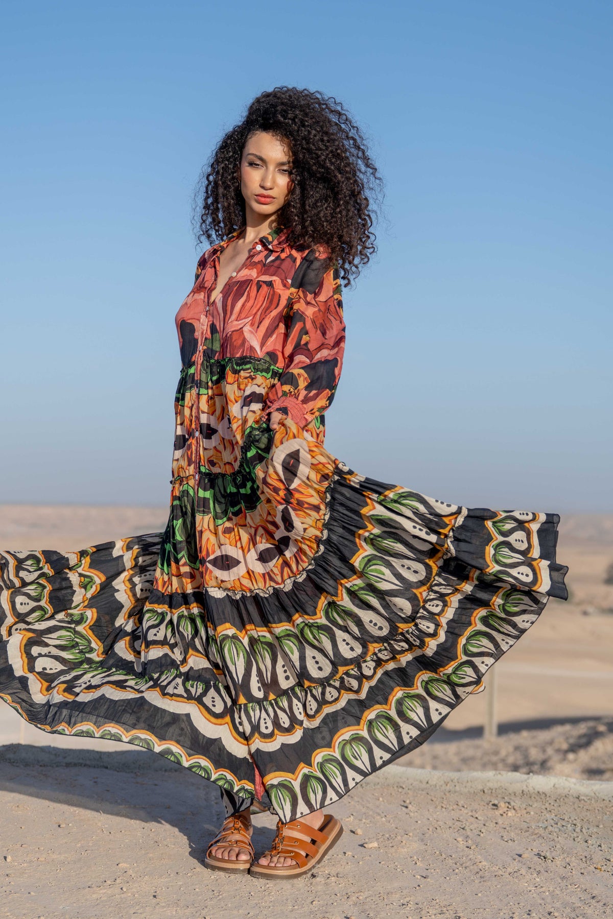 Robe chemise longue à imprimé multicolore, structurée par une patte de boutonnage sur toute la longueur. Sa coupe ample est complétée par une jupe à volants, apportant du volume et un tombé fluide.