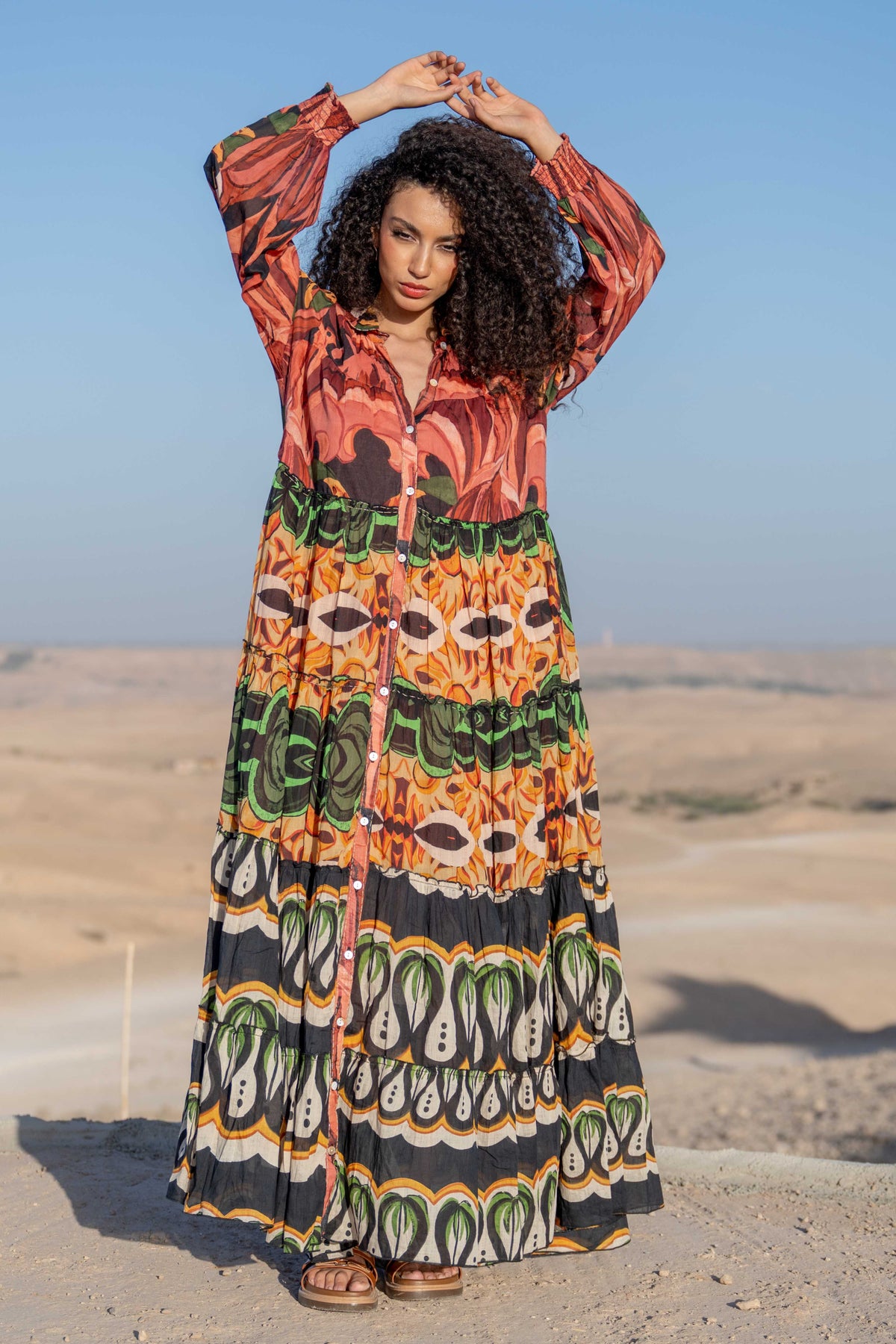 Dotée de manches longues, cette robe offre un bon équilibre entre confort et structure. Les différents motifs et bandes colorées créent un visuel fort, tout en restant facile à porter au quotidien ou en tenue estivale.