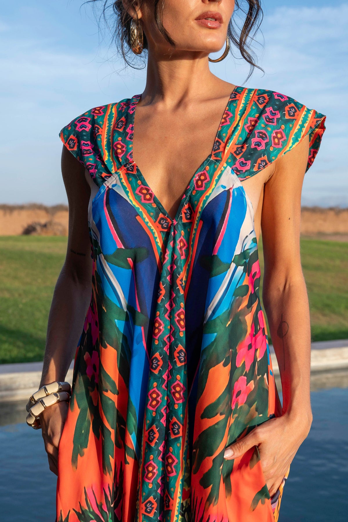Robe longue fluide au style estival et bohème, sublimée par de motifs tropicaux graphiques aux couleurs vibrantes. Son décolleté en V et sa coupe ample offrent une silhouette élégante et aérienne.