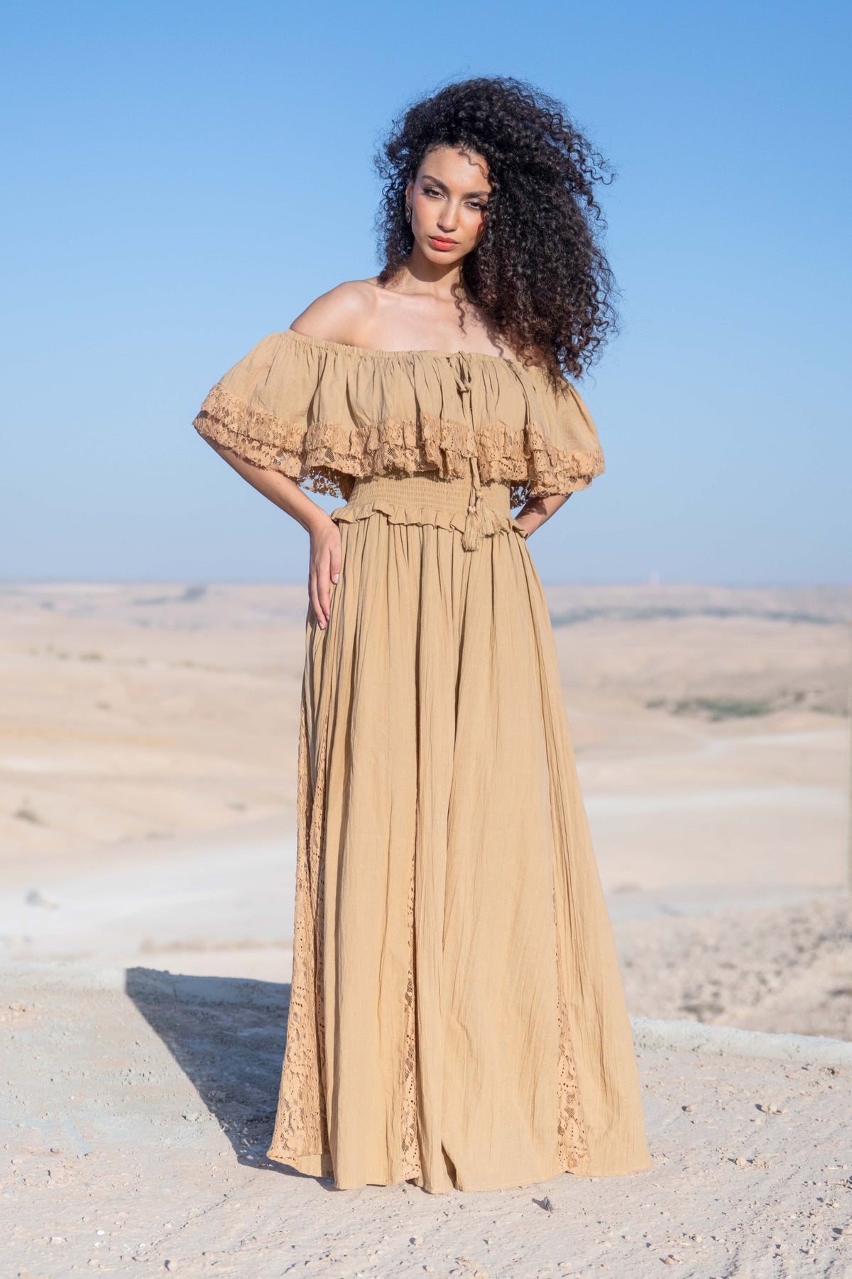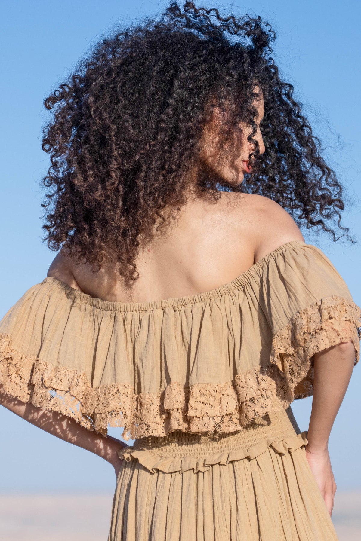 La taille smockée structure la robe et assure un maintien confortable, tandis que la jupe longue crée un mouvement naturel à chaque pas. Les détails en dentelle ajoutent du relief et renforcent l’esprit bohème de la pièce. Une robe facile à porter, parfaite pour les journées ensoleillées ou les looks vacances.
