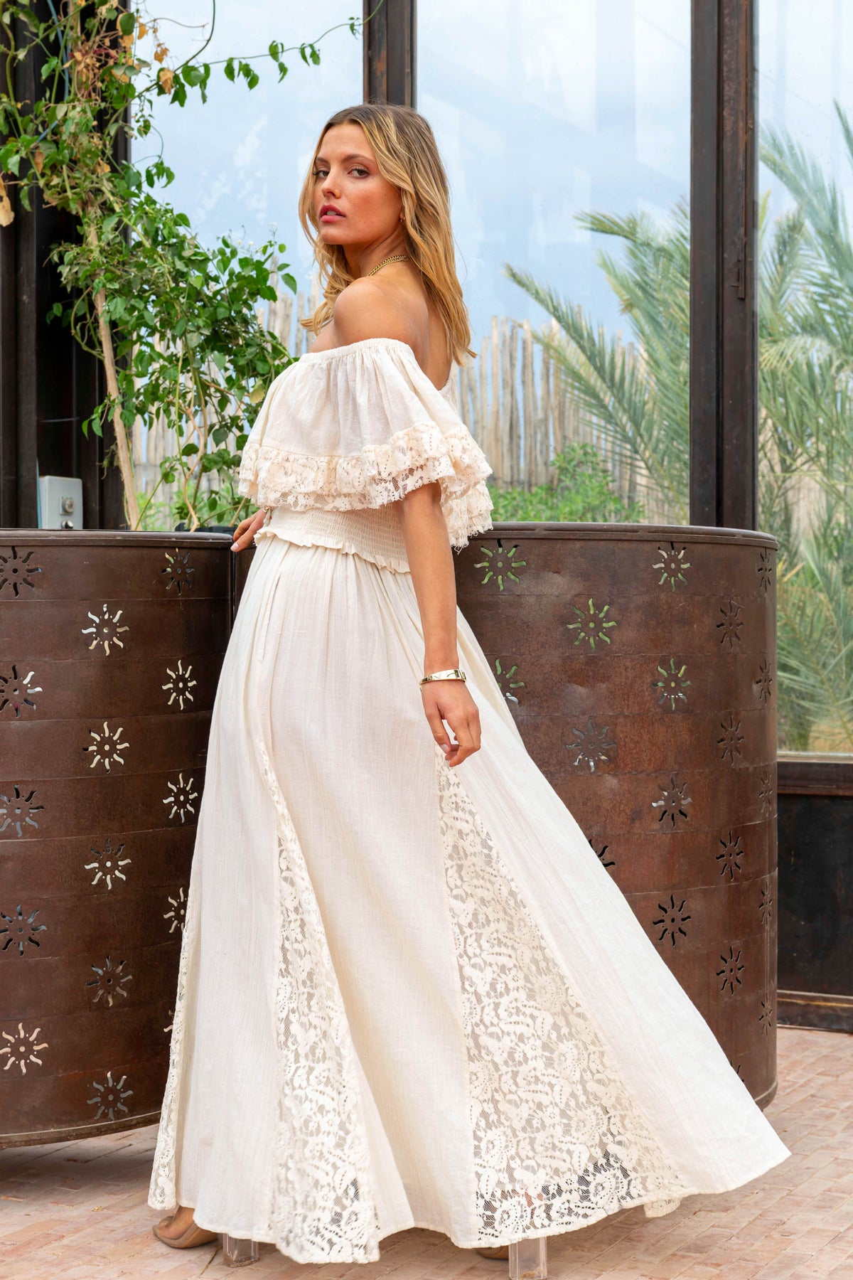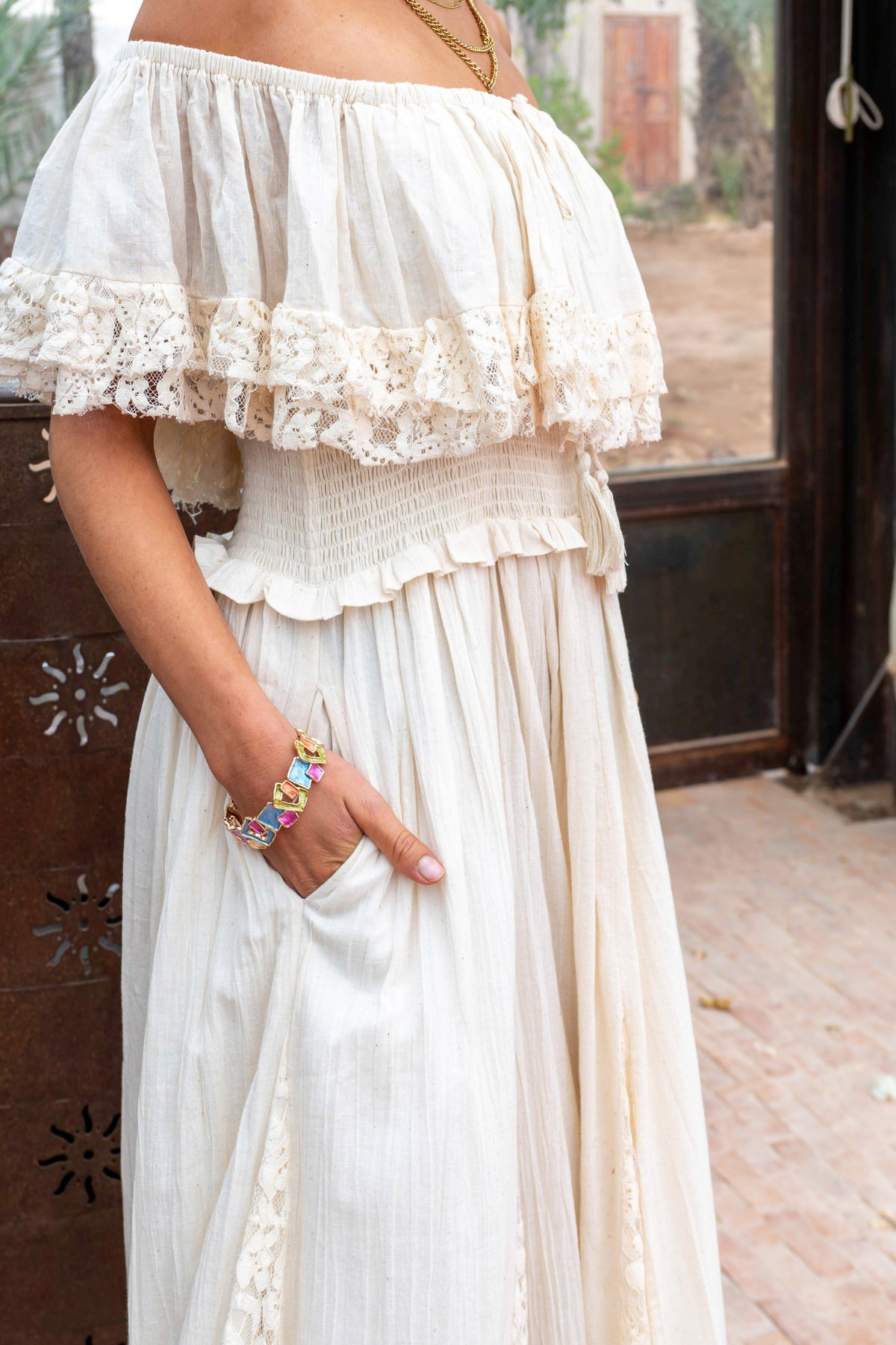La taille smockée structure la robe et assure un maintien confortable, tandis que la jupe longue crée un mouvement naturel à chaque pas. Les détails en dentelle ajoutent du relief et renforcent l’esprit bohème de la pièce. Une robe facile à porter, parfaite pour les journées ensoleillées ou les looks vacances.