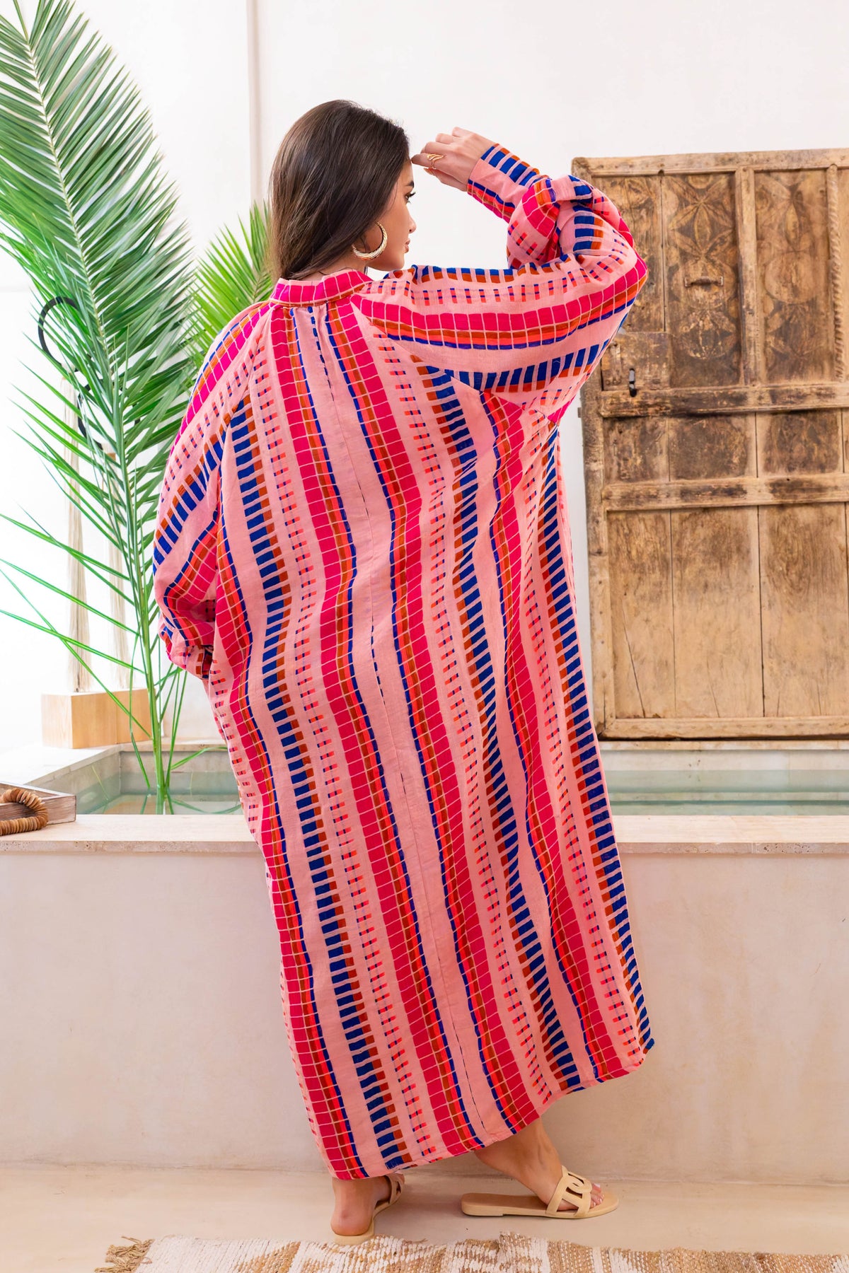Son col tunisien avec patte boutonnée apporte une touche moderne et épurée. Les manches longues droites, légèrement amples, renforcent l’allure élégante et confortable de la pièce. Un cordon à nouer à l’encolure, terminé par des pompons contrastés, vient souligner le détail bohème sans surcharger.
