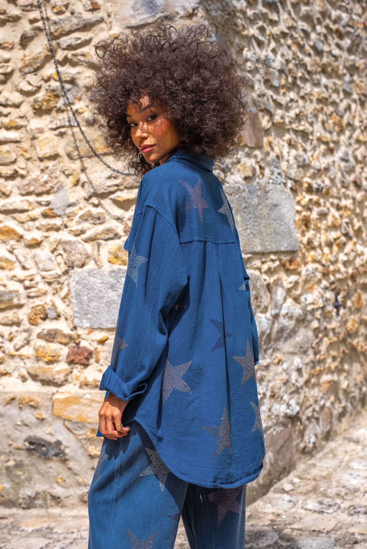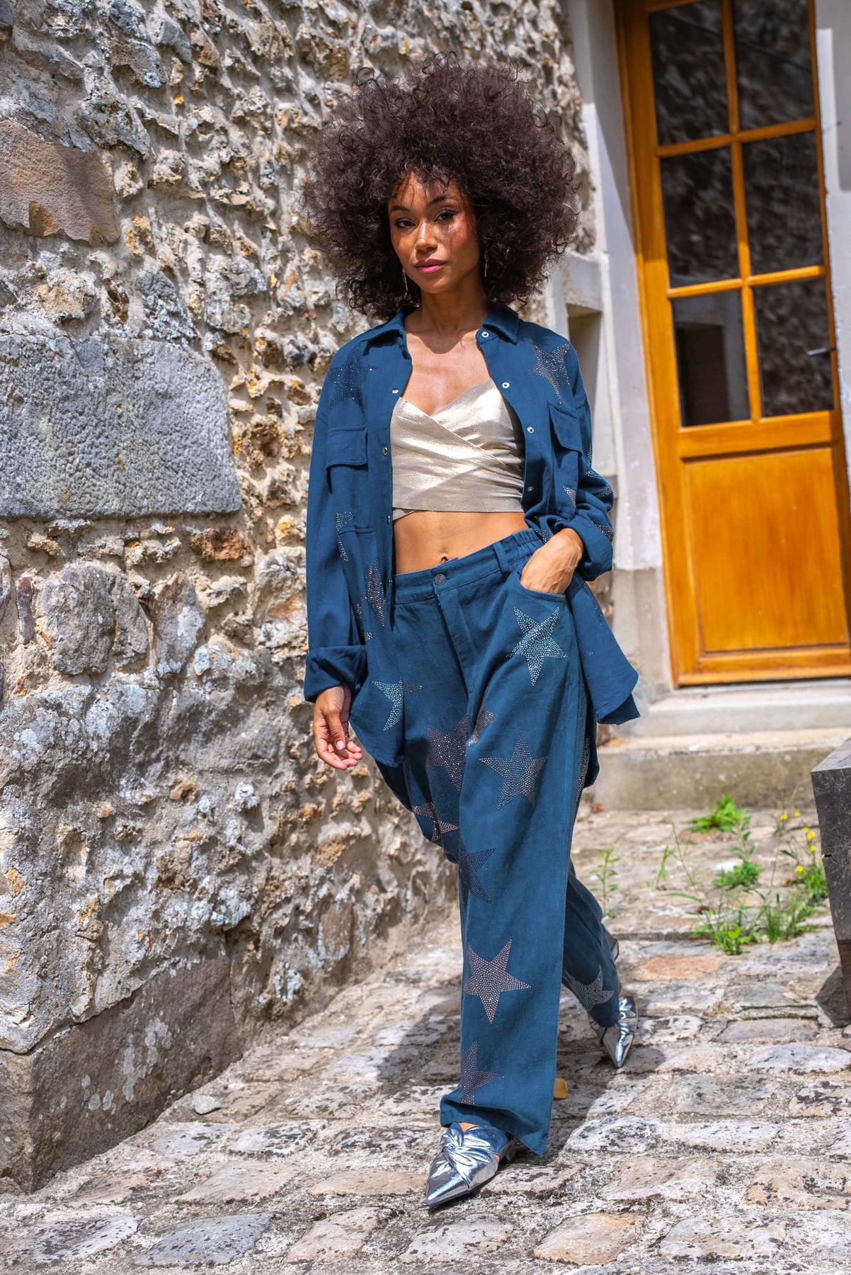 Cet ensemble se compose de la veste chemise oversize Sofia et du pantalon droit Strike, réalisés dans une toile souple effet denim. Leur particularité ? Des étoiles scintillantes en strass appliquées en all-over, qui apportent éclat et originalité à cette silhouette confortable et affirmée.
