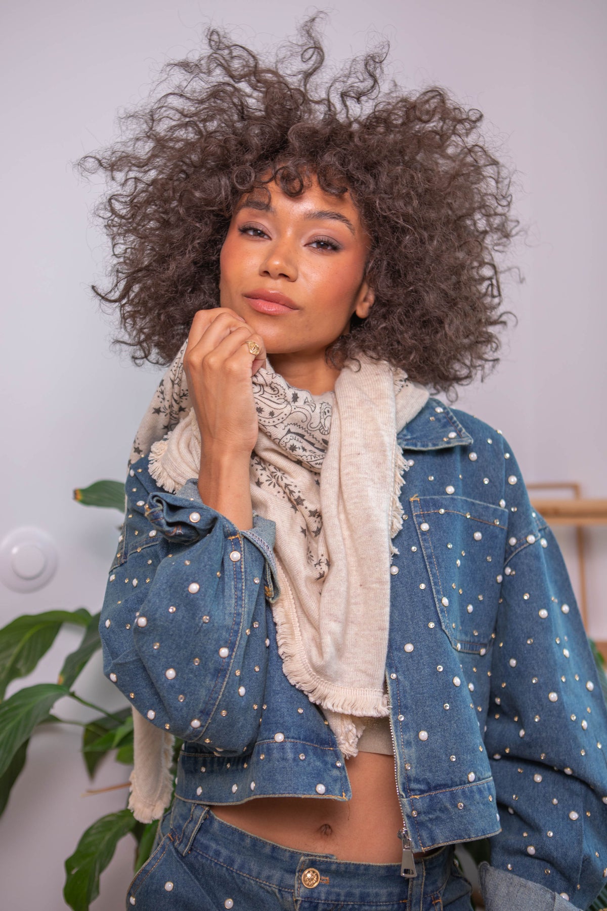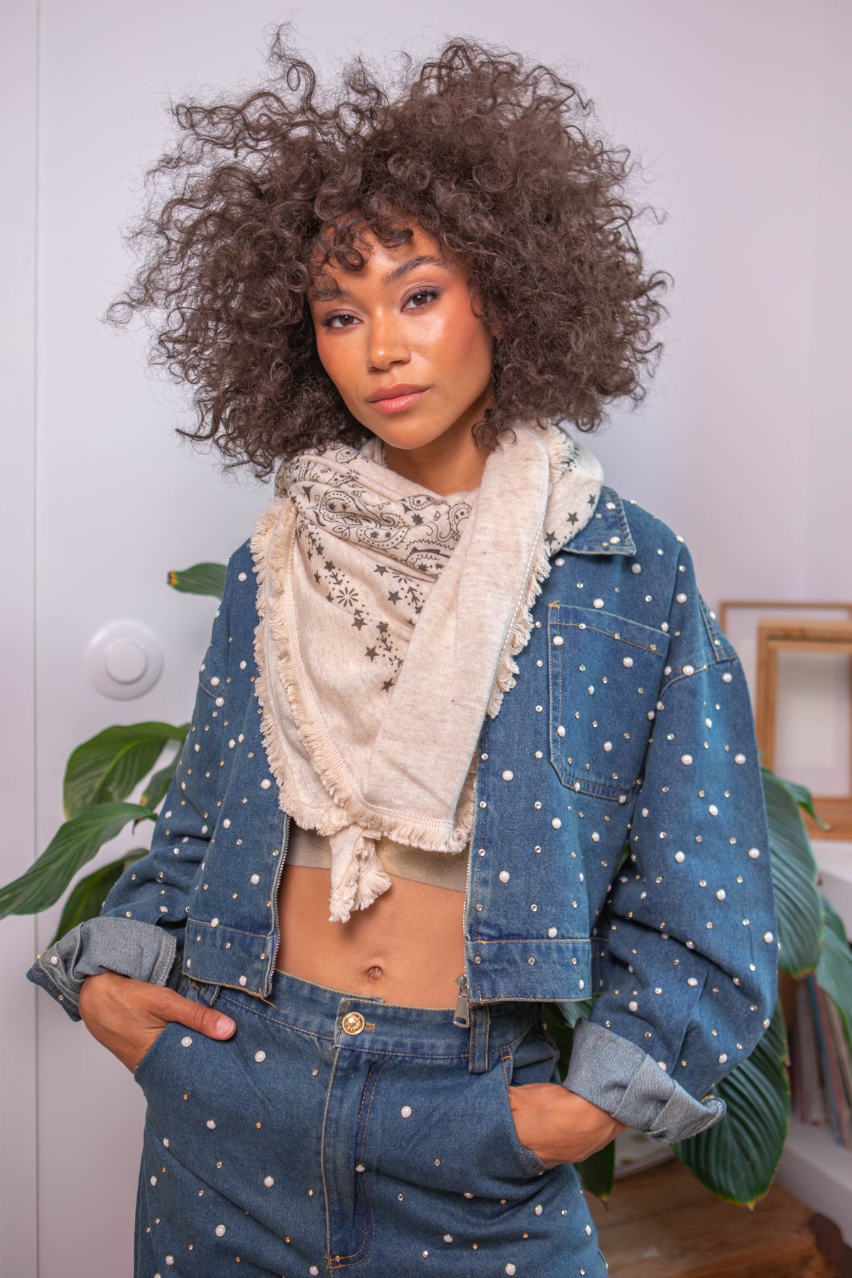 Foulard en maille douce, sublimé par un imprimé bandana délicat. Ses finitions effilochées apportent une touche bohème et décontractée. Léger et confortable, il accessoirise vos looks de saison avec féminité et originalité.