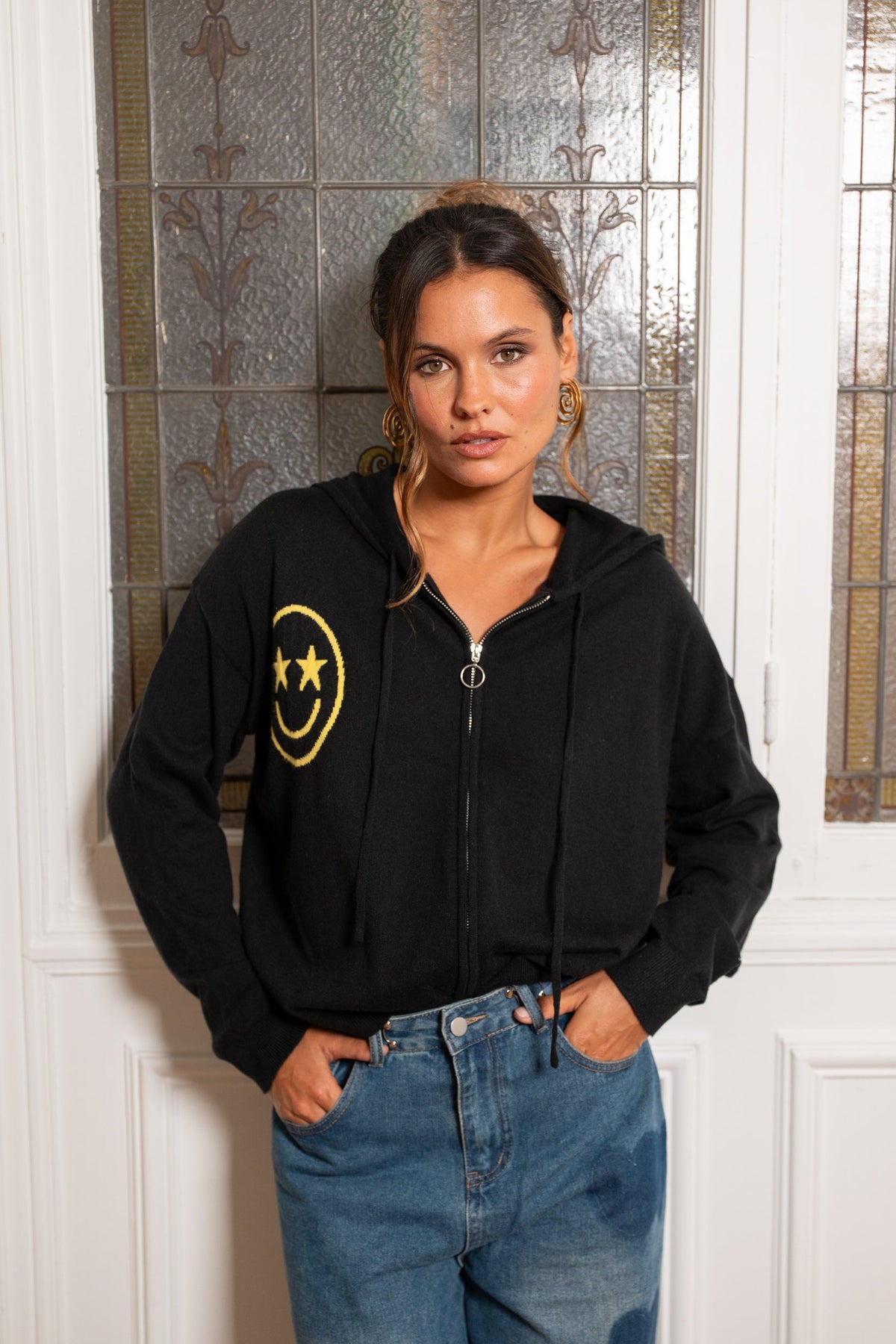 Sweat zippé à capuche en maille douce, idéal pour un look comfy et stylé. Son détail smiley  sur la poitrine apporte une touche fun et originale. Facile à porter au quotidien, il se mixe aussi bien avec son pantalon assorti qu’avec un jean.