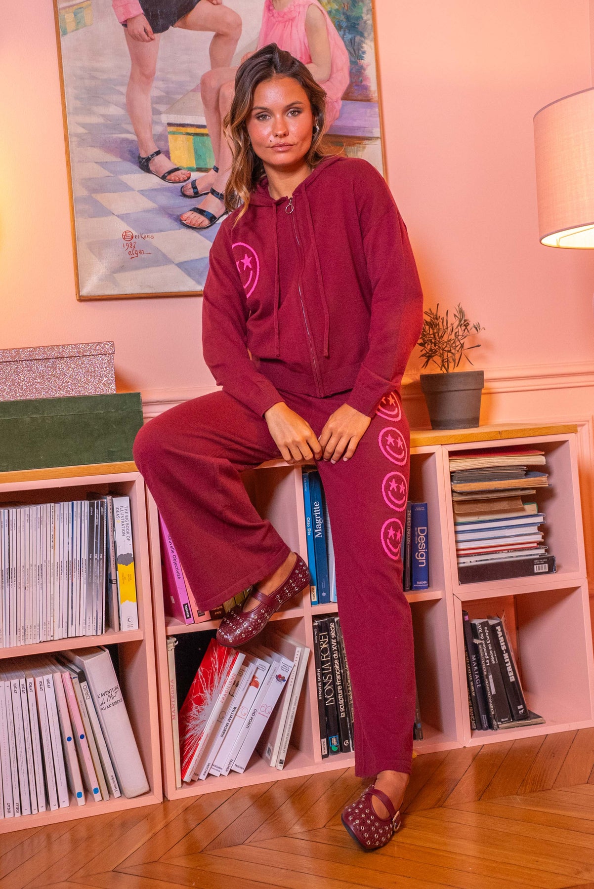 Sweat zippé à capuche en maille douce, idéal pour un look comfy et stylé. Son détail smiley sur la poitrine apporte une touche fun et originale. Facile à porter au quotidien, il se mixe aussi bien avec son pantalon assorti qu’avec un jean.