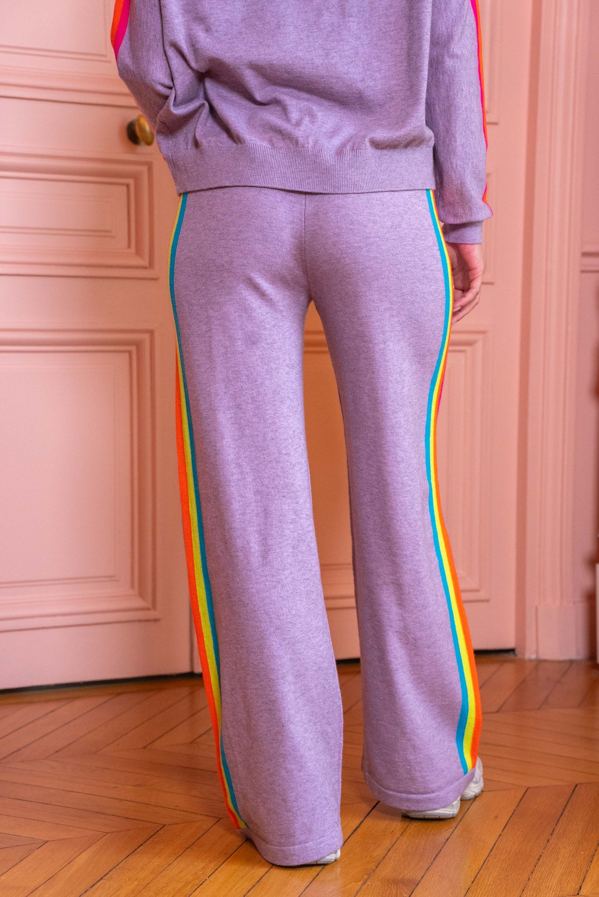 Les bandes colorées façon arc-en-ciel descendent le long des jambes et dynamisent la pièce. Il peut se porter en ensemble avec les pulls Cassy, Capsule et Capucine.