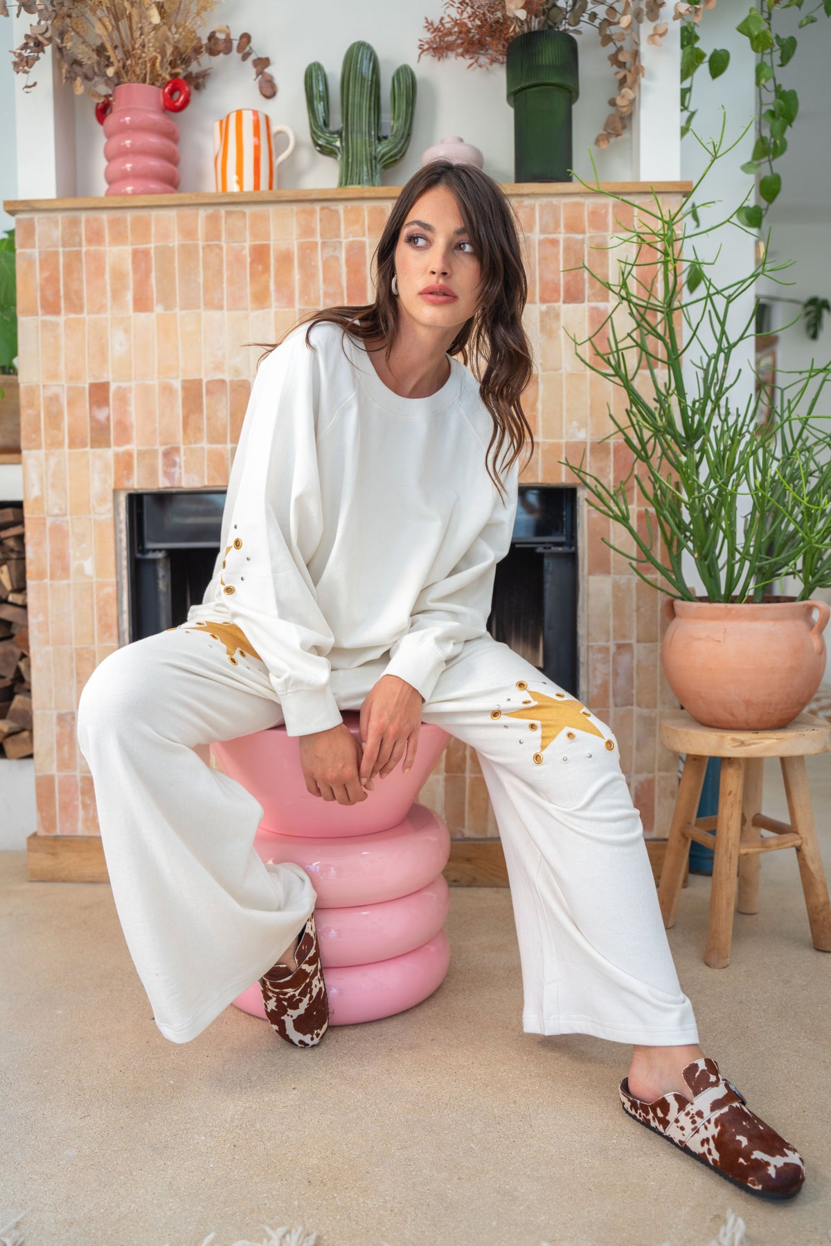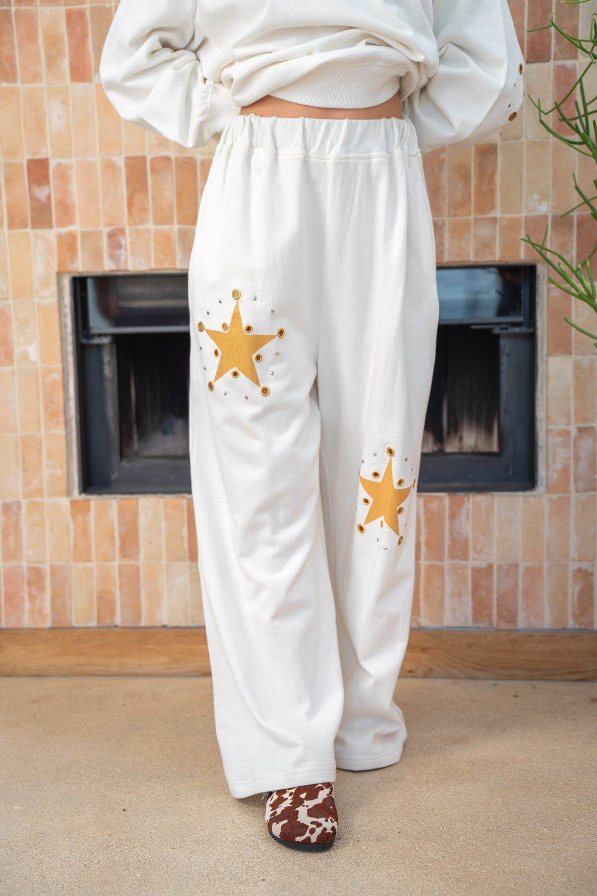 Sa coupe large et fluide apporte une liberté de mouvement idéale, tandis que ses étoiles dorées appliquées sur les jambes rappellent le détail graphique du haut.