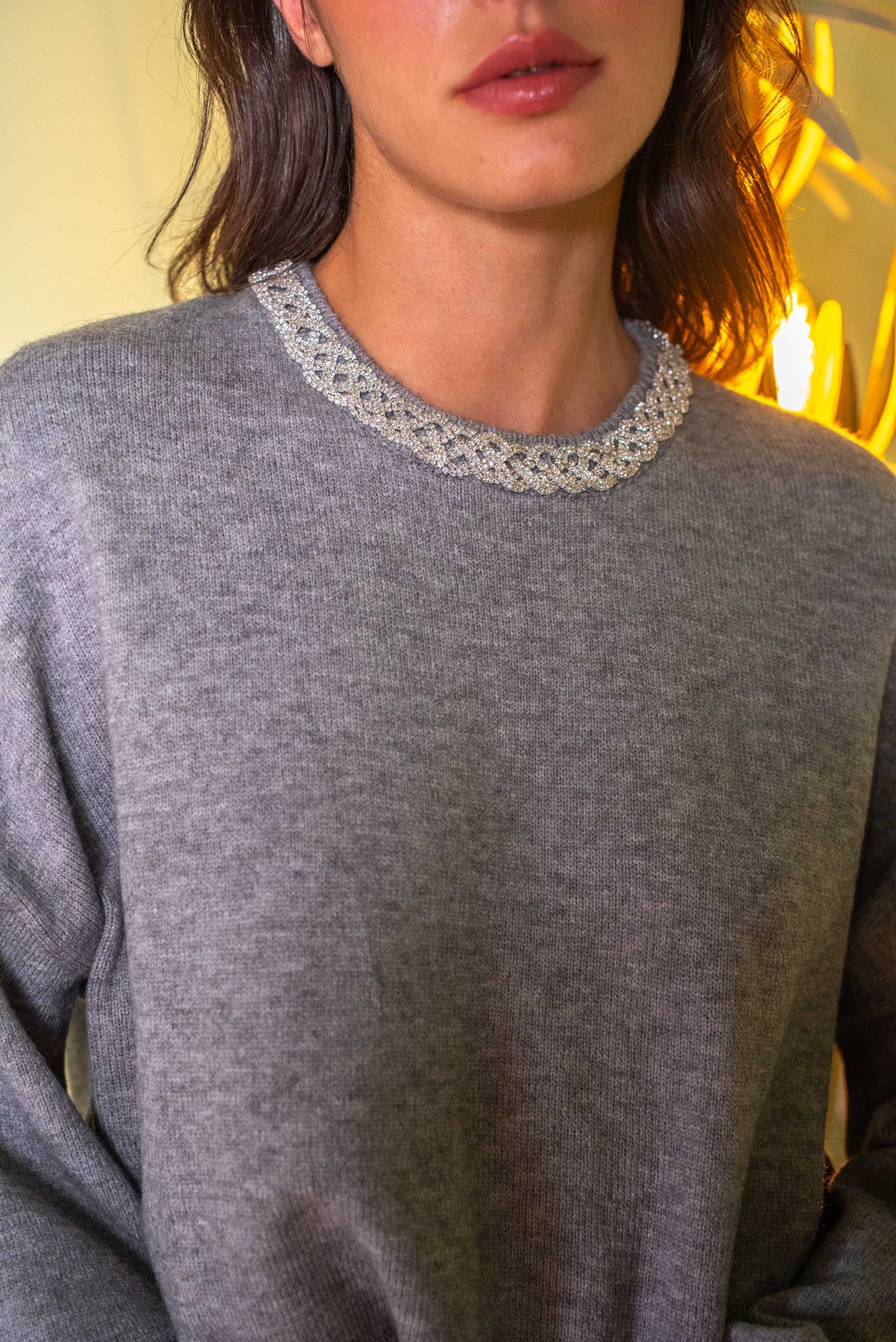 Pull en maille douce, sublimé par un col rond orné de perles et strass scintillants façon collier intégré. Sa coupe simple et raffinée permet de l’associer facilement à un jean pour un look casual chic, ou à une jupe pour une allure plus habillée.