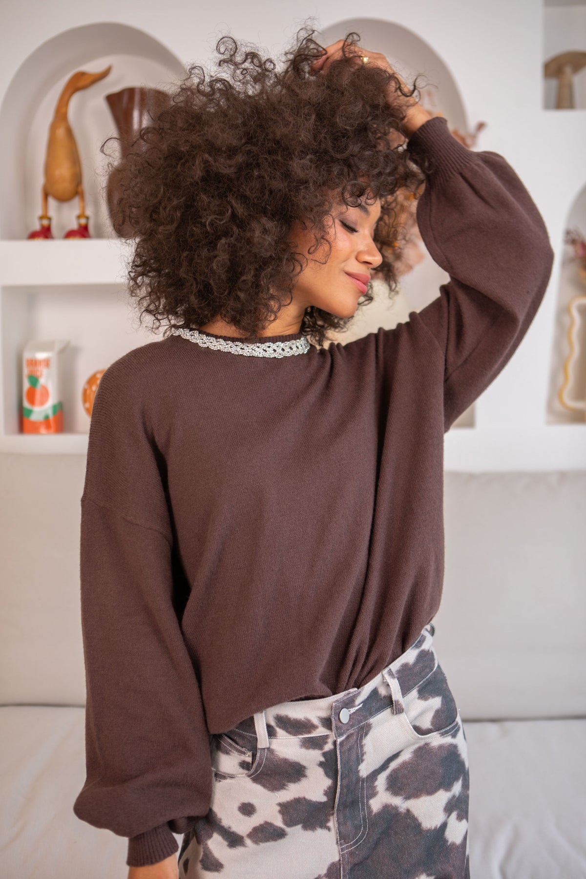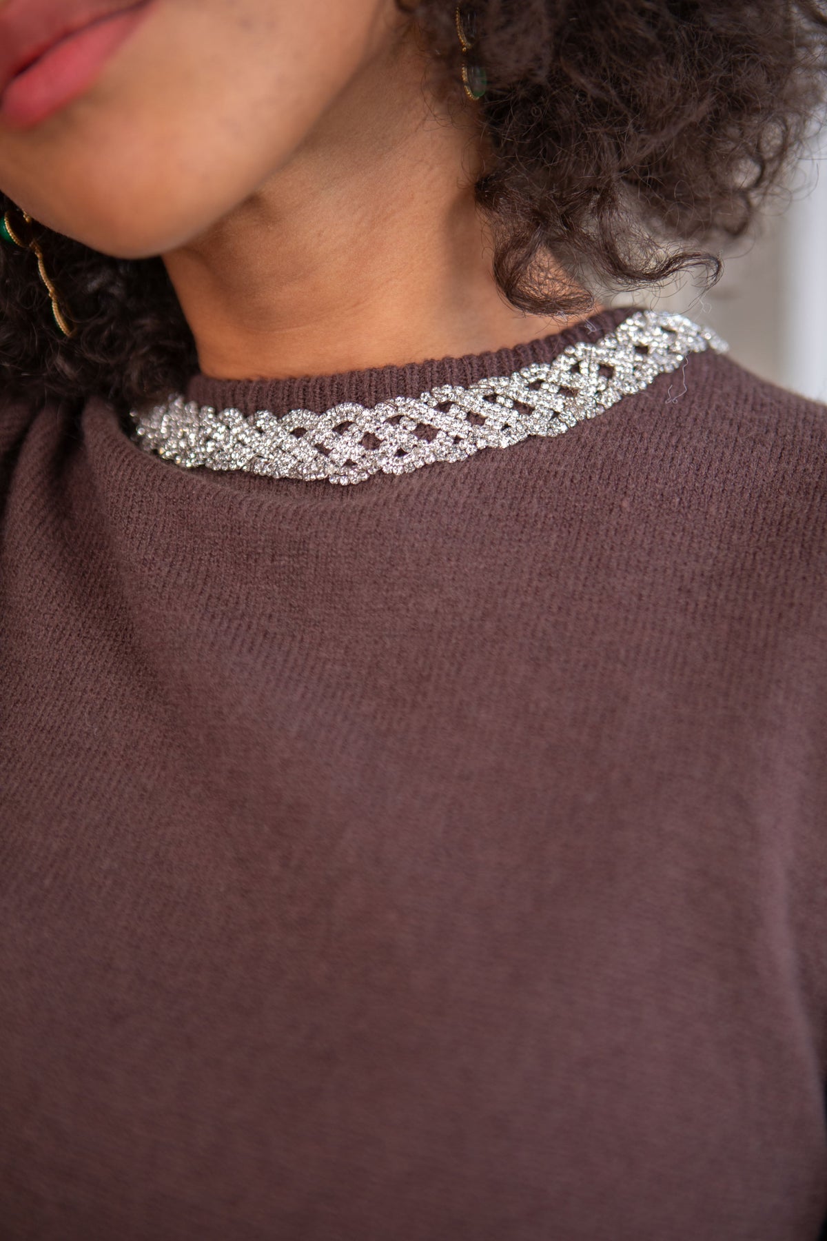 Pull en maille douce, sublimé par un col rond orné de perles et strass scintillants façon collier intégré. Sa coupe simple et raffinée permet de l’associer facilement à un jean pour un look casual chic, ou à une jupe pour une allure plus habillée.