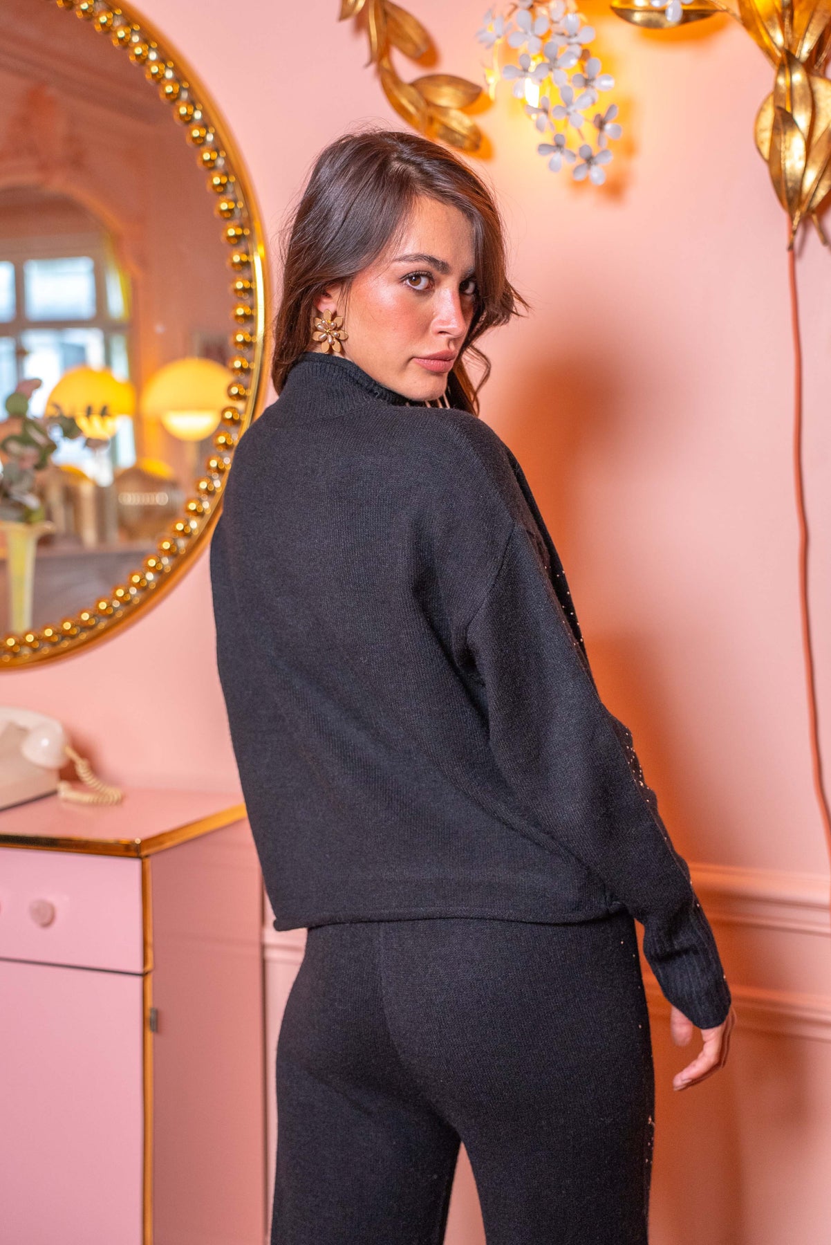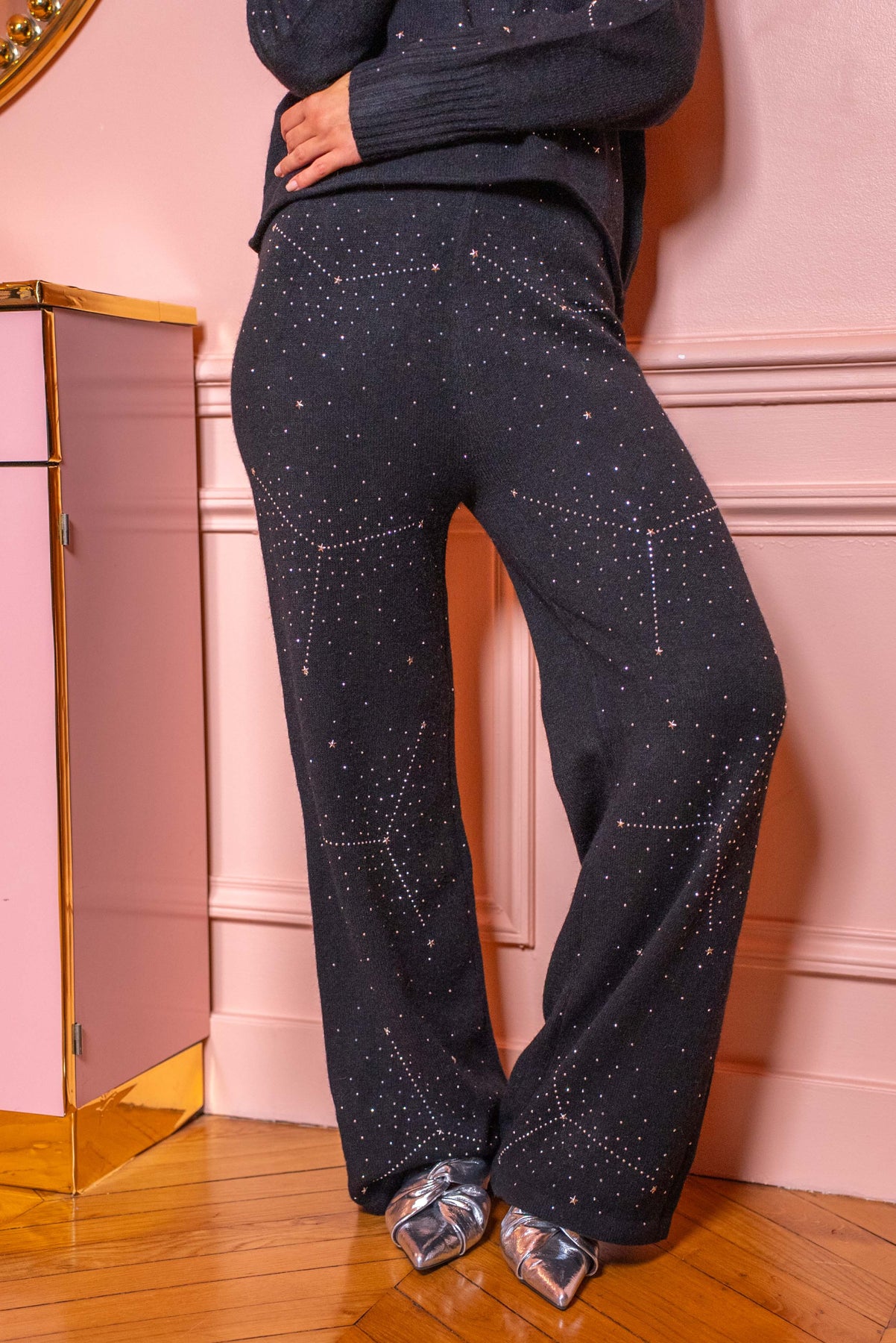 Ce set deux pièces en maille douce vous enveloppe de confort avec une touche de magie. Orné de motifs constellations en strass, il se compose d’un pull col montant et d’un pantalon fluide taille haute. Parfait pour un look cosy, élégant et céleste.