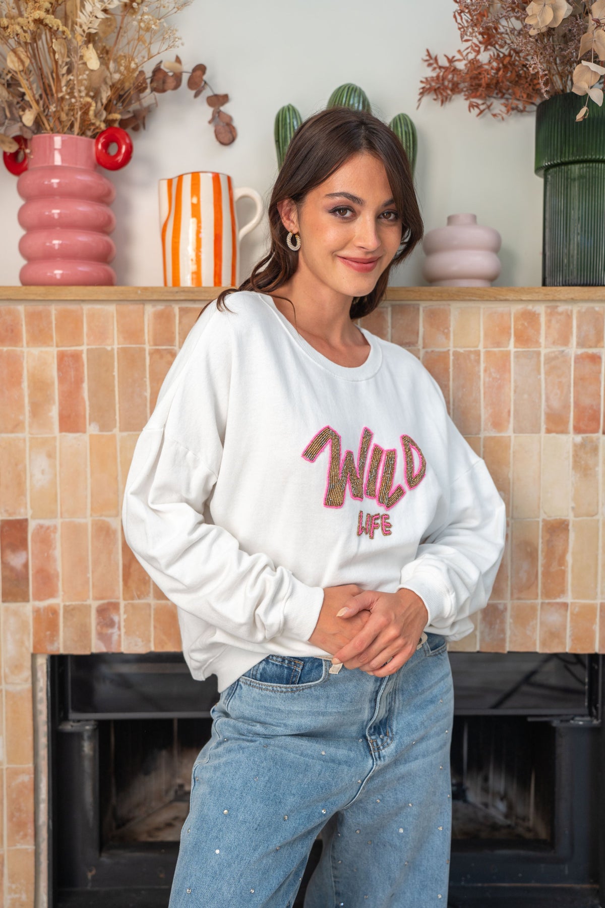 Un sweat confortable et stylé qui affiche haut et fort son message « WILD LIFE ». Avec sa coupe loose et son détail brodé de perles colorées, il allie confort et touche fun.