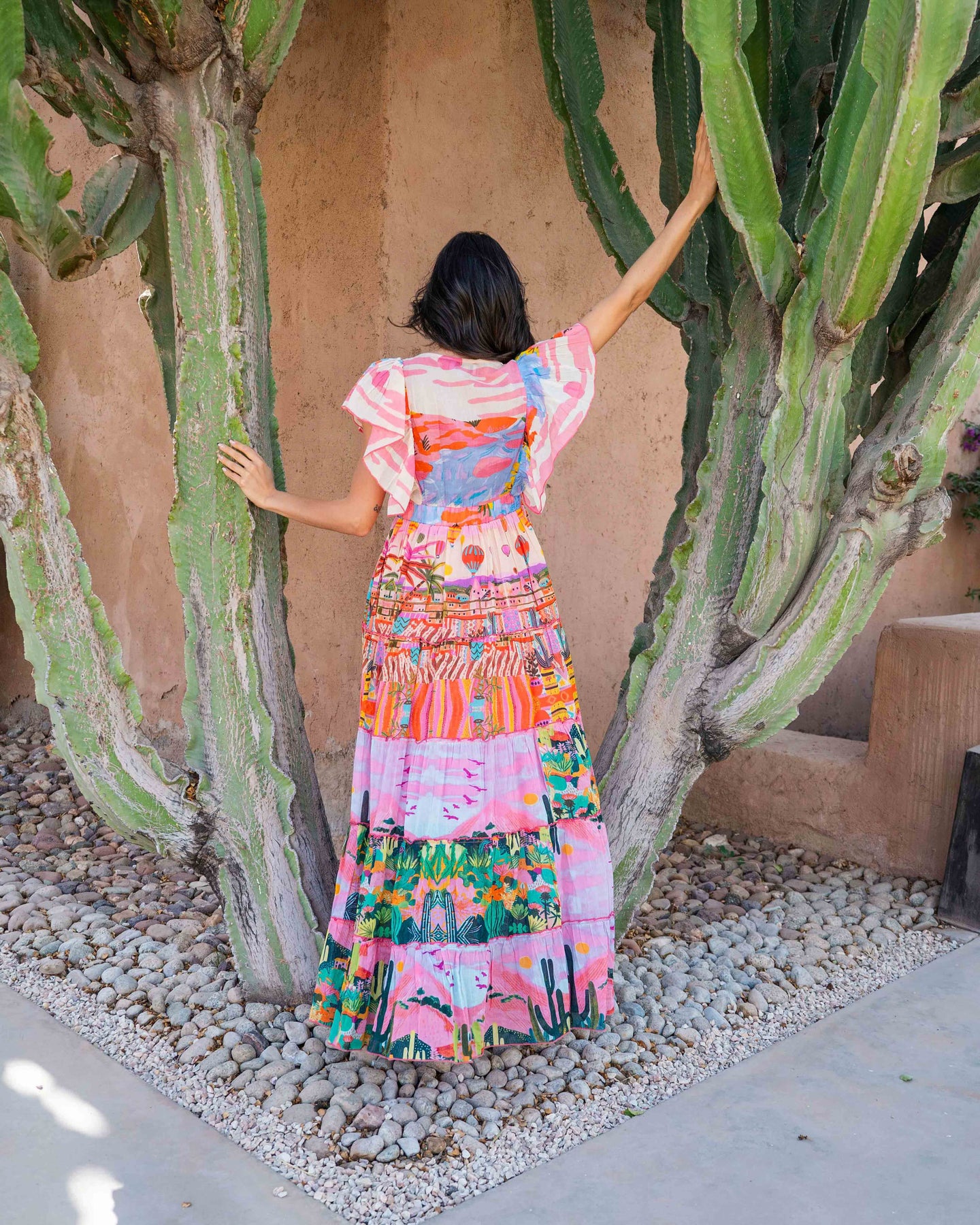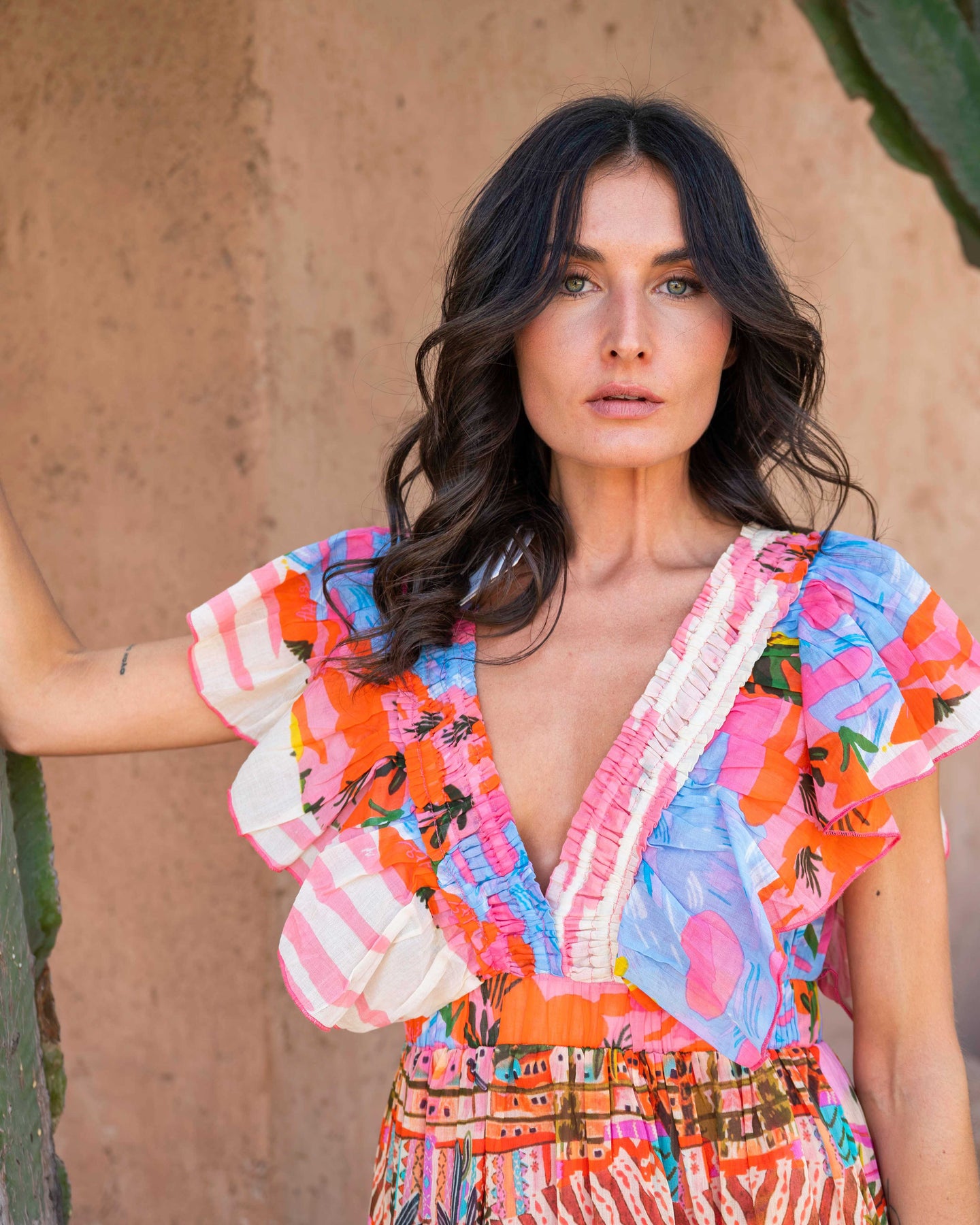 Le décolleté structuré met en valeur le buste tout en assurant un maintien naturel. La taille marquée sous poitrine équilibre la silhouette, tandis que la jupe longue à volants étagés offre un tombé fluide et aérien. Les manches courtes volantées apportent une touche féminine et élégante. Une pièce idéale pour la saison estivale, facile à porter au quotidien comme en vacances.