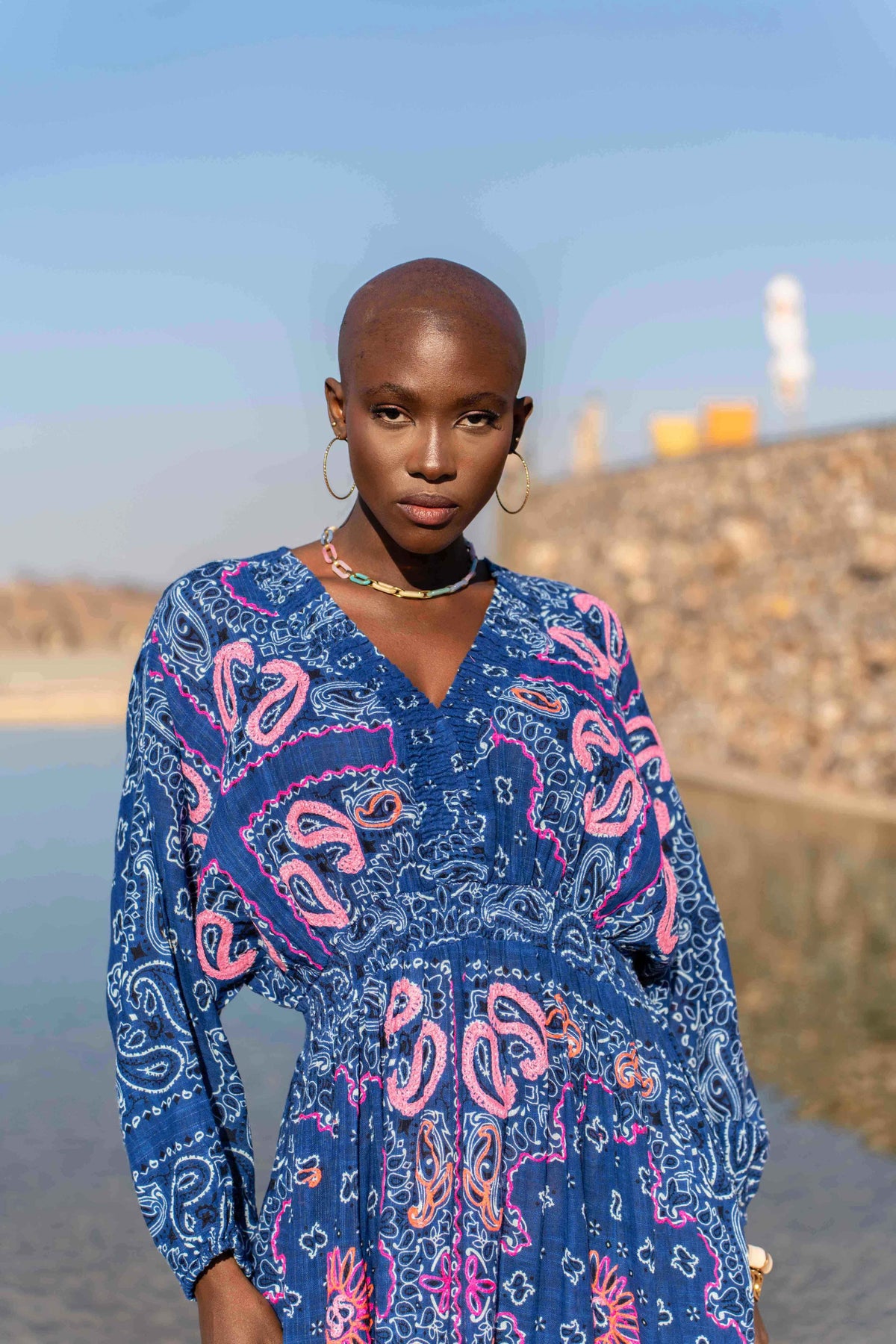 Robe longue en lin, au style bohème et féminin, sublimée par de motifs imprimés colorés. Son col V brodé apporte une touche élégante, tandis que la taille smockée structure la silhouette tout en offrant un confort optimal.