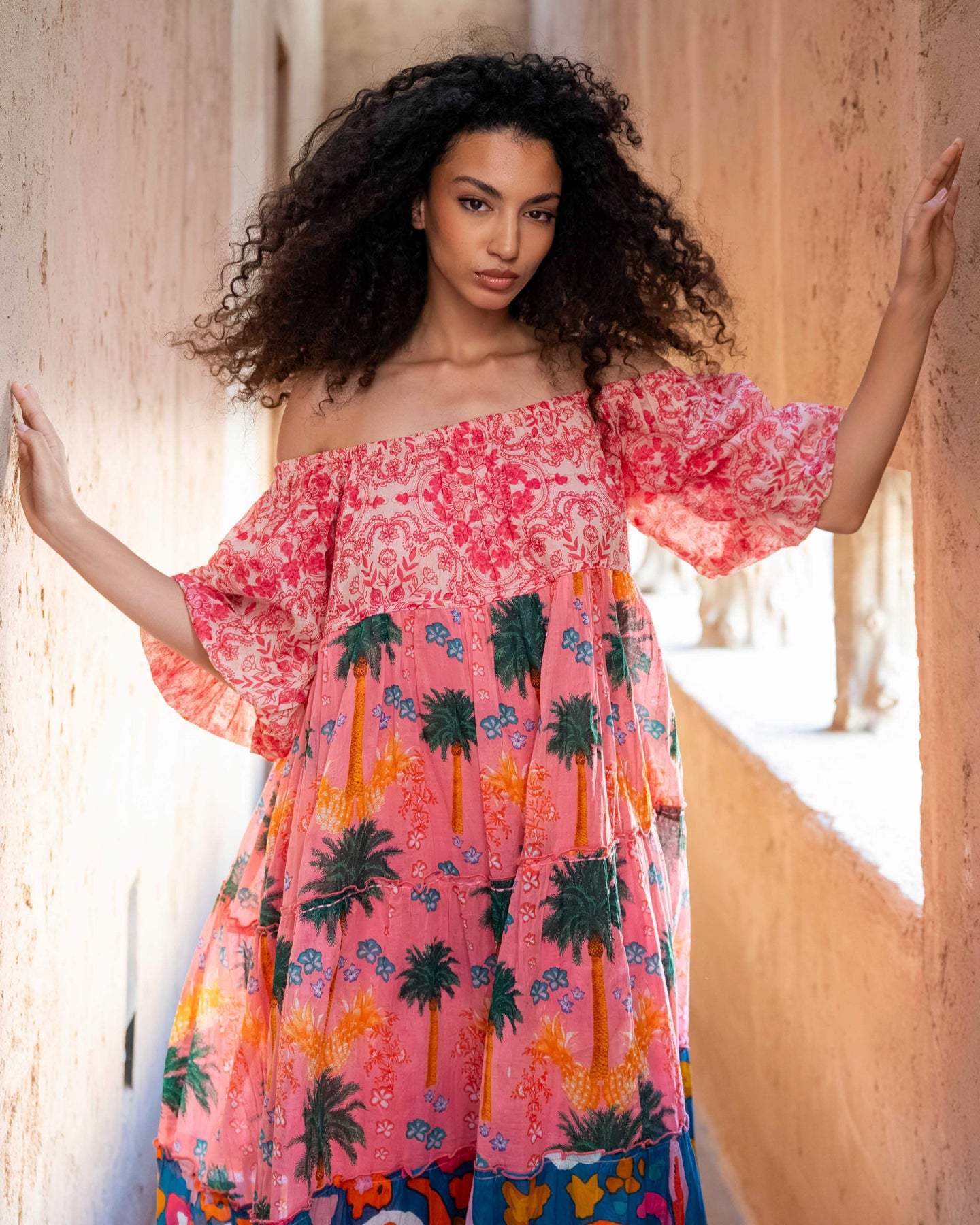 Sa coupe ample à volants crée un tombé fluide et aérien. L’encolure élastiquée assure un maintien confortable tout en mettant les épaules en valeur. Les manches courtes bouffantes apportent une touche bohème et féminine. Une pièce idéale pour les journées estivales ou les looks vacances.