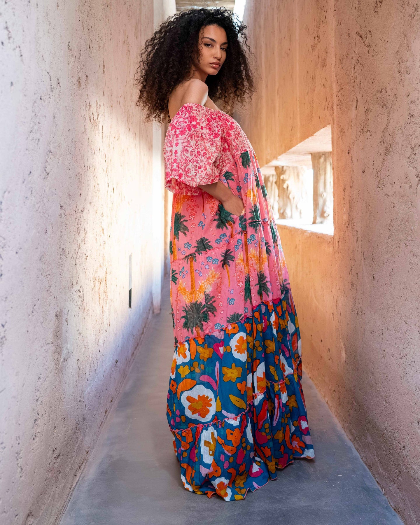 Robe longue à épaules dénudées, confectionnée dans un tissu léger à imprimé multicolore.