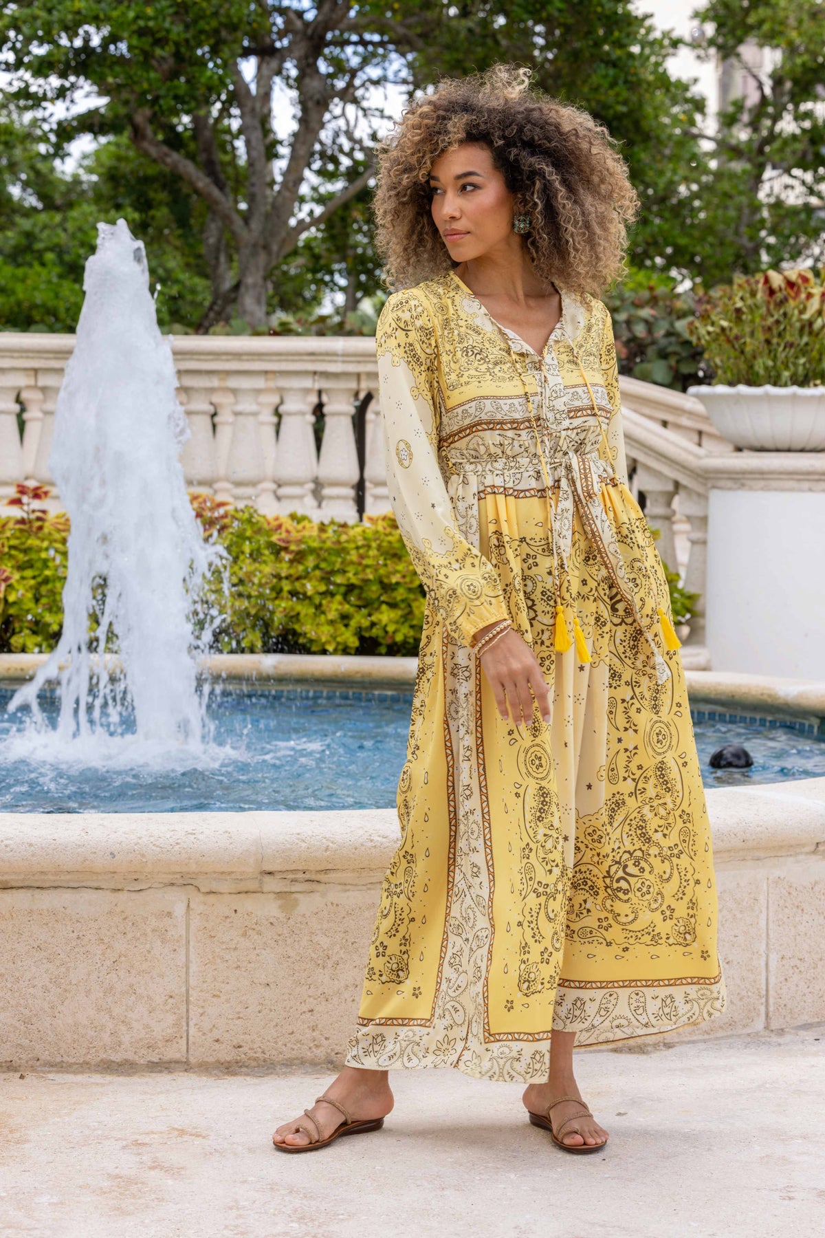 Robe longue imprimée, à la coupe fluide et à la taille ceinturée pour une silhouette structurée. Elle présente un décolleté en V, des manches longues et un imprimé floral graphique réparti sur l’ensemble du modèle.