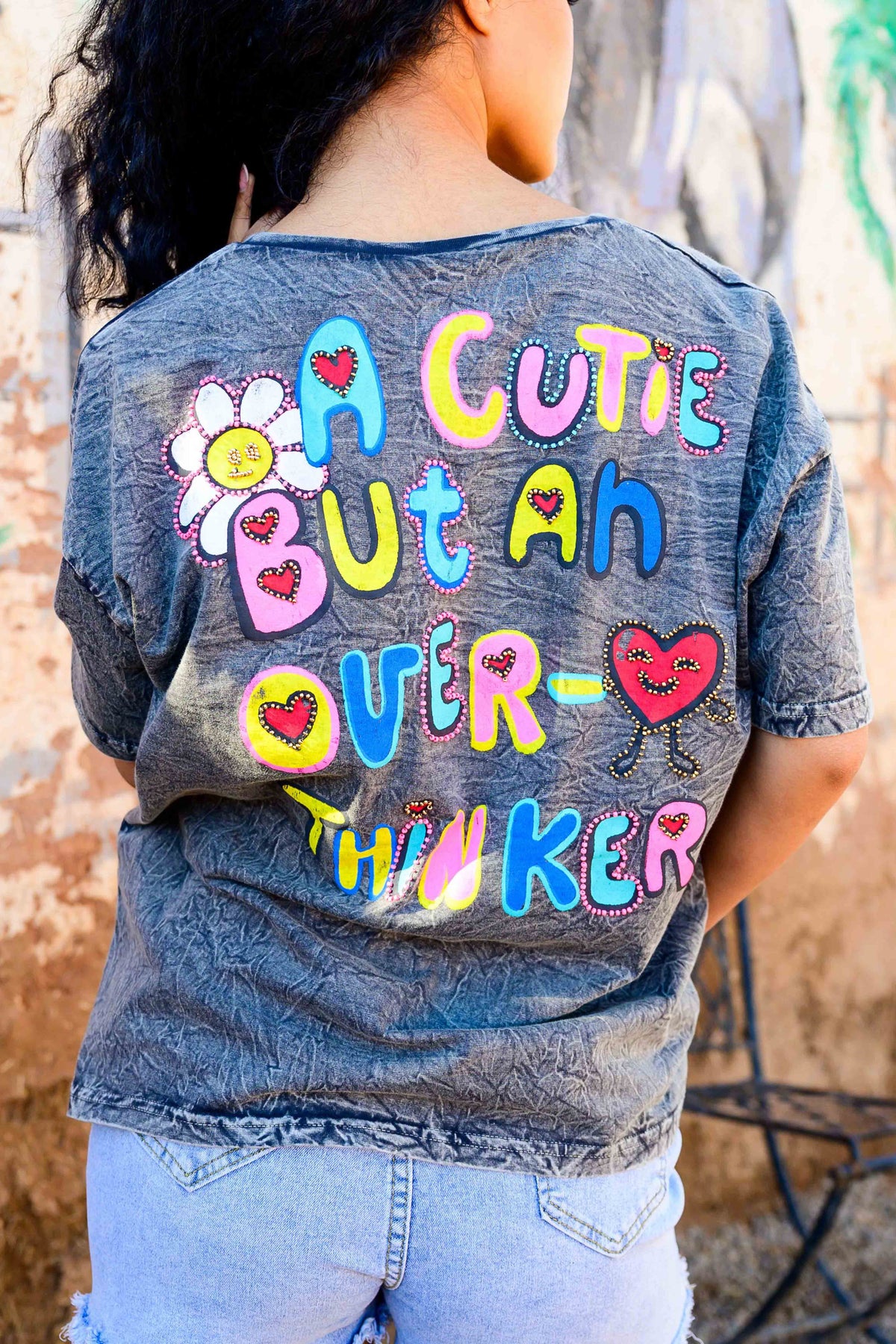 T-shirt fluide à message brodé multicolore, au style moderne, fun et lifestyle.