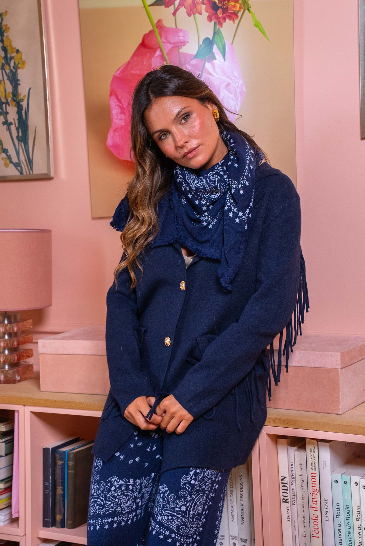 Blazer à la coupe moderne, rehaussé de franges pour une touche tendance et originale. Ses boutons dorés ajoutent une note chic qui contraste avec son esprit casual.