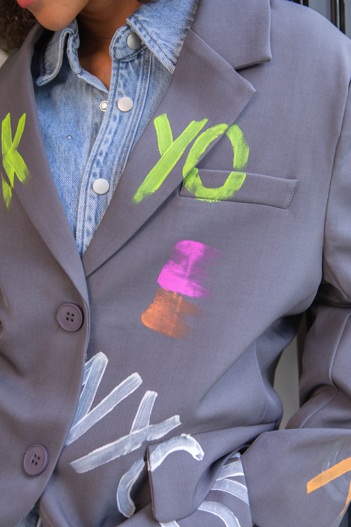 Blazer coupe oversize, entièrement revisité avec des graffitis peints multicolores qui lui donnent un style unique et audacieux. Entre esprit arty et allure urbaine, c’est la pièce parfaite pour celles qui aiment affirmer leur personnalité. À porter sur un jean, une robe ou un pantalon chic pour casser les codes avec originalité.