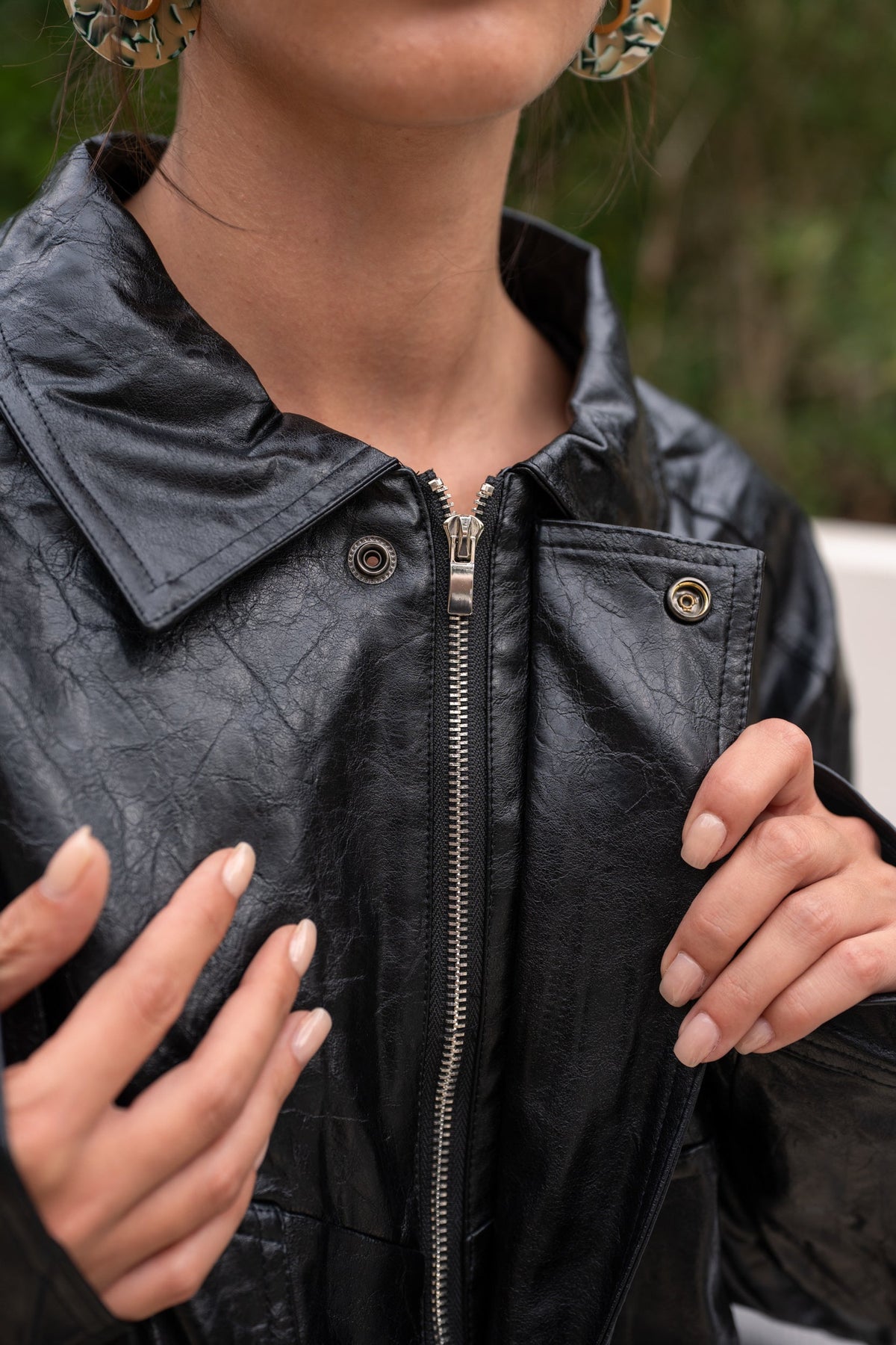 Veste oversize en similicuir, à la fois chic et moderne. Sa coupe ample et ses finitions soignées en font une pièce forte, parfaite pour dynamiser un look casual ou habillé.