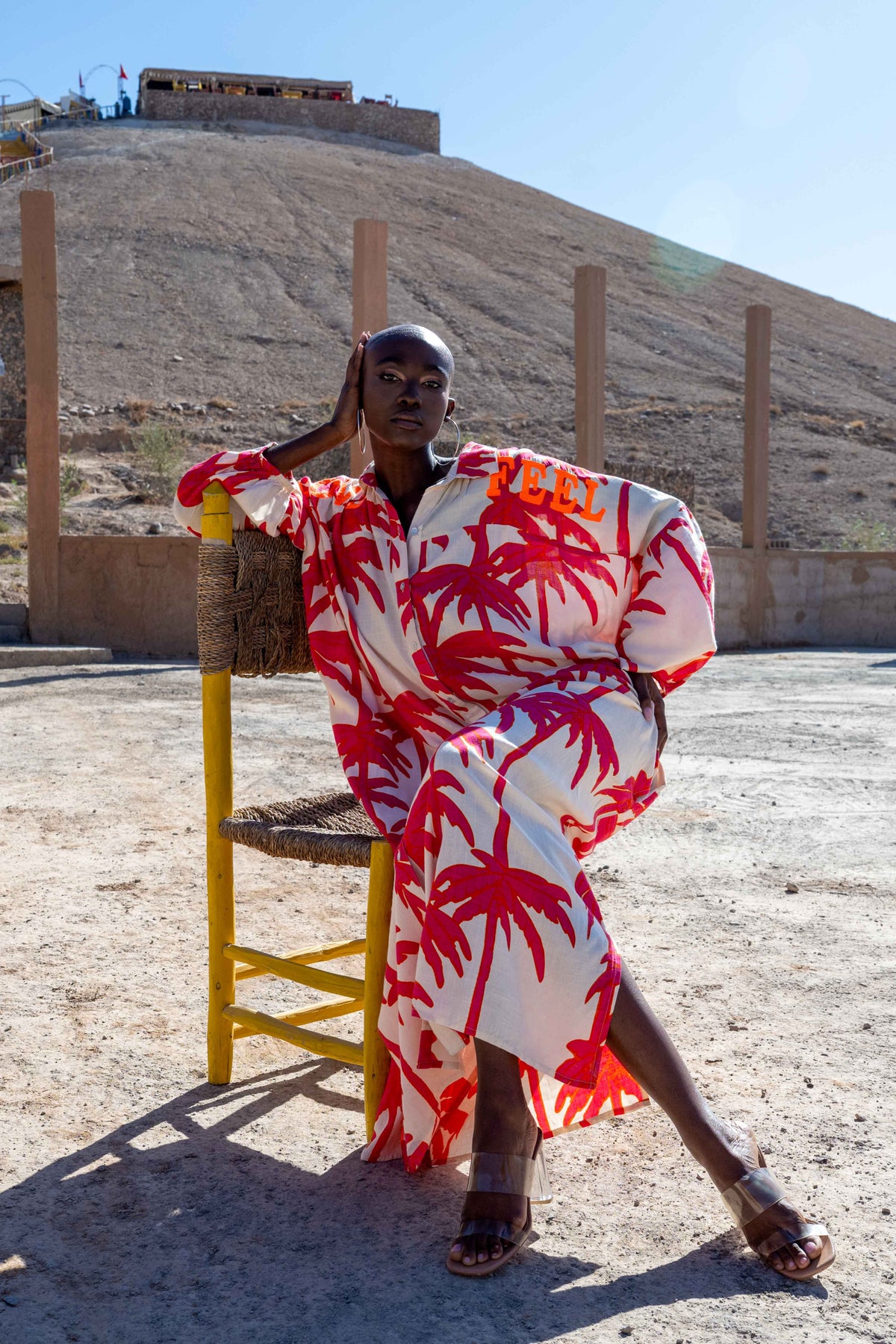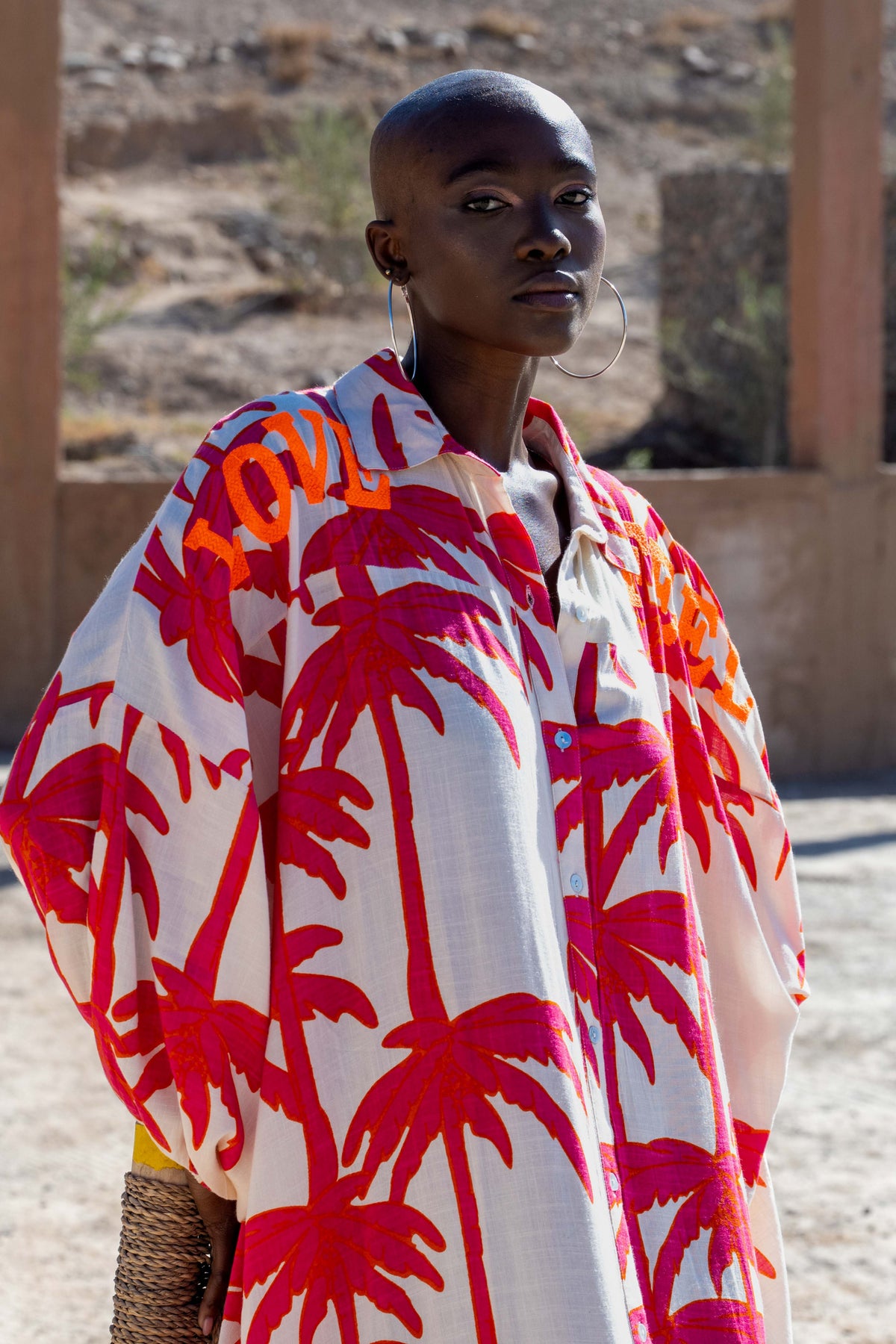 Robe chemise longue à l’allure fluide et décontractée, idéale pour un look estival chic. Son imprimé palmiers graphique apporte une touche exotique et moderne, tandis que sa coupe droite et ample assure un tombé élégant et confortable.