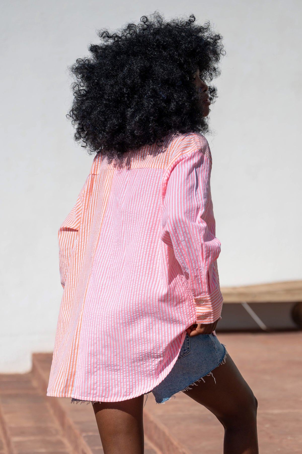 Chemise oversize au style cool et affirmé, parfaite pour twister un look du quotidien. Son jeu de rayures crée un contraste frais et moderne, tandis que la coupe ample apporte une allure décontractée ultra tendance.