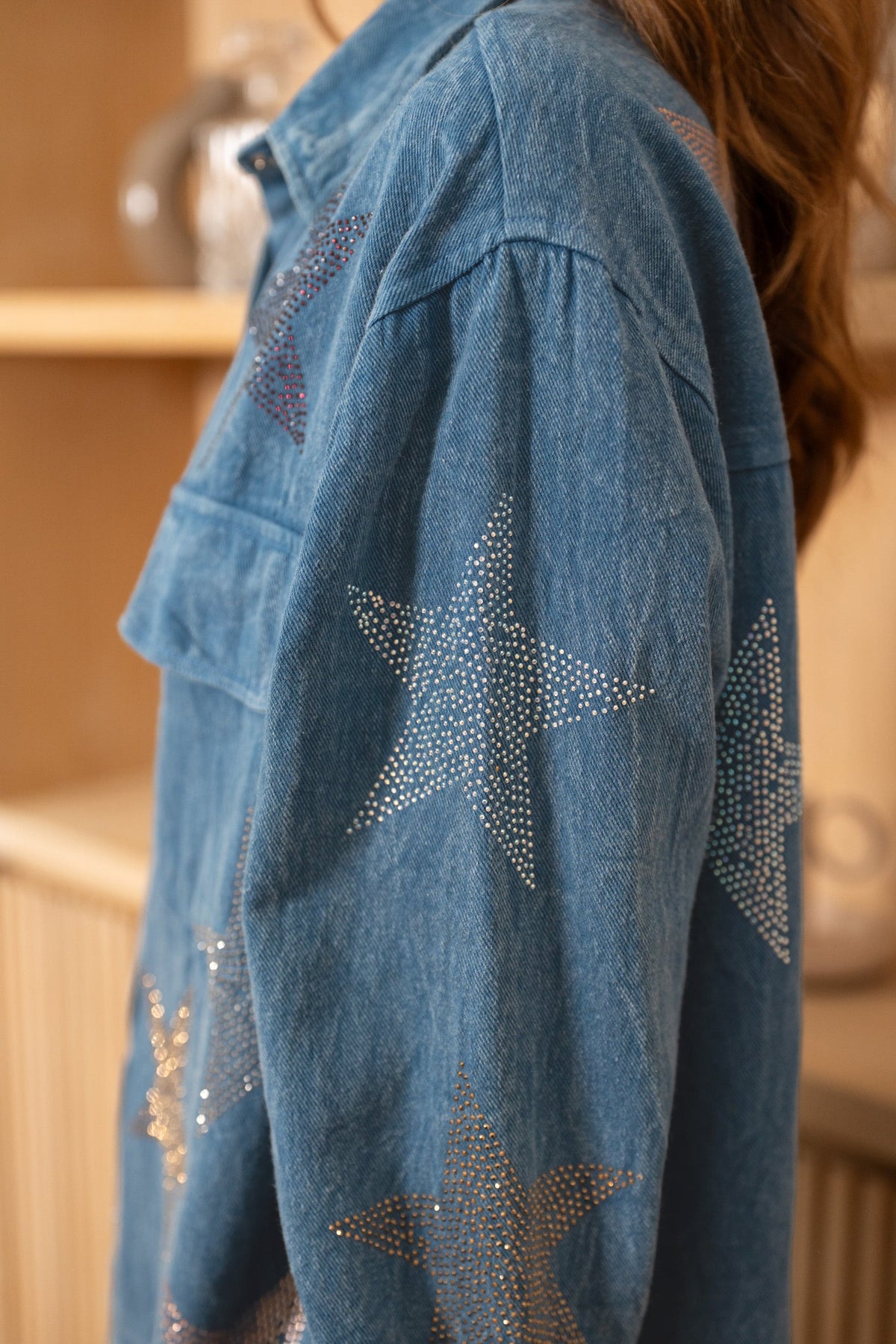 Cet ensemble se compose de la veste chemise oversize Sofia et du pantalon droit Strike, réalisés dans une toile souple effet denim. Leur particularité ? Des étoiles scintillantes en strass appliquées en all-over, qui apportent éclat et originalité à cette silhouette confortable et affirmée.