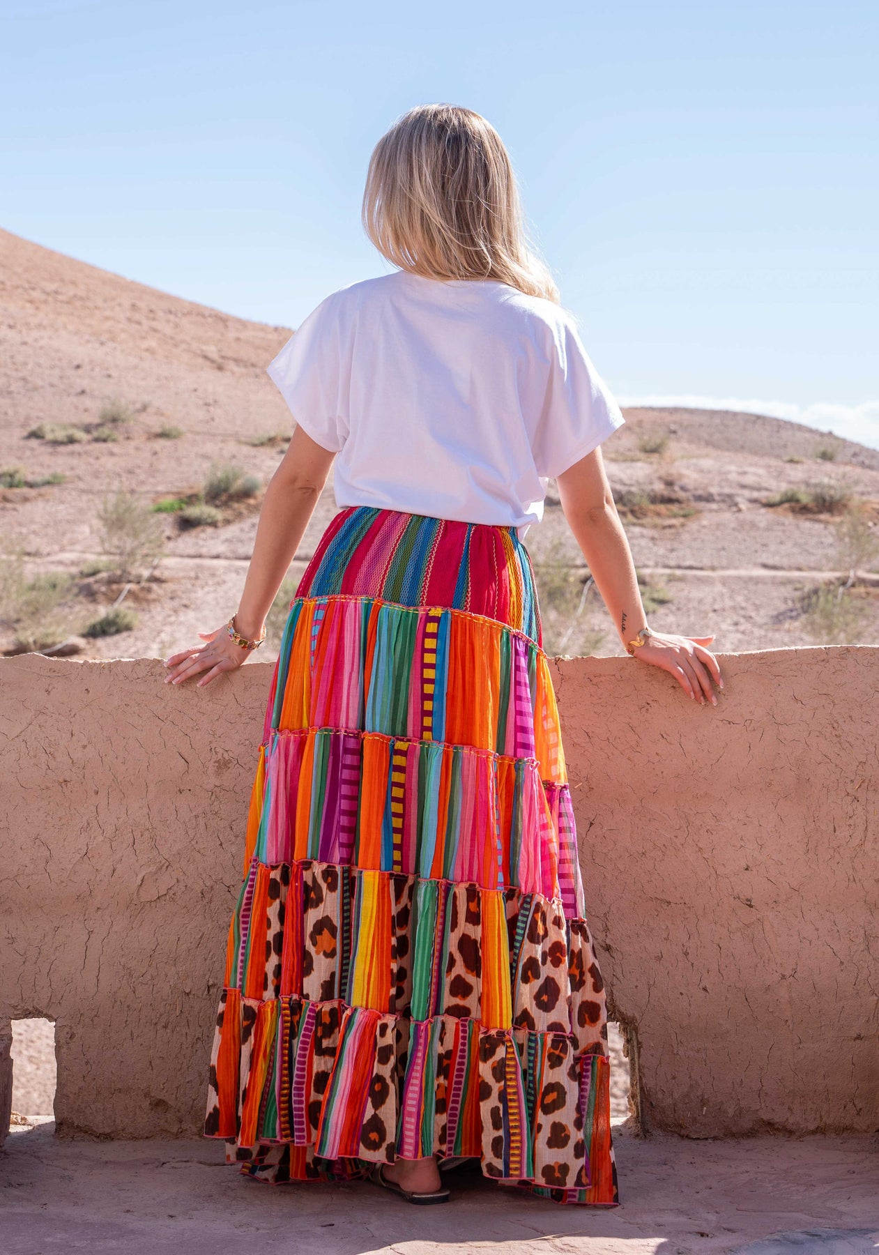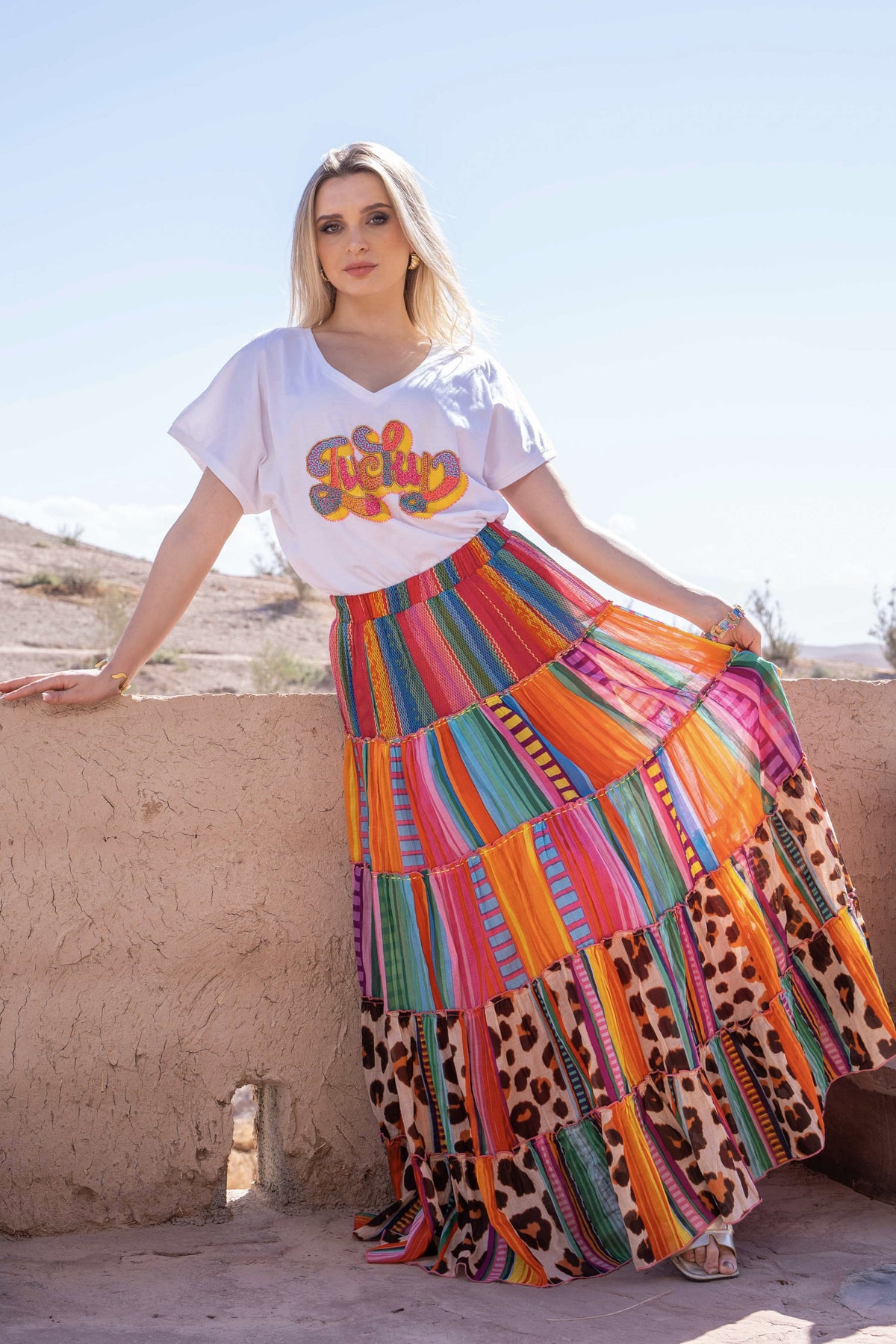 T-shirt fluide à motif perlé, au style bohème, solaire et affirmé.